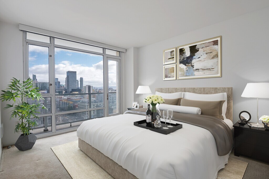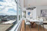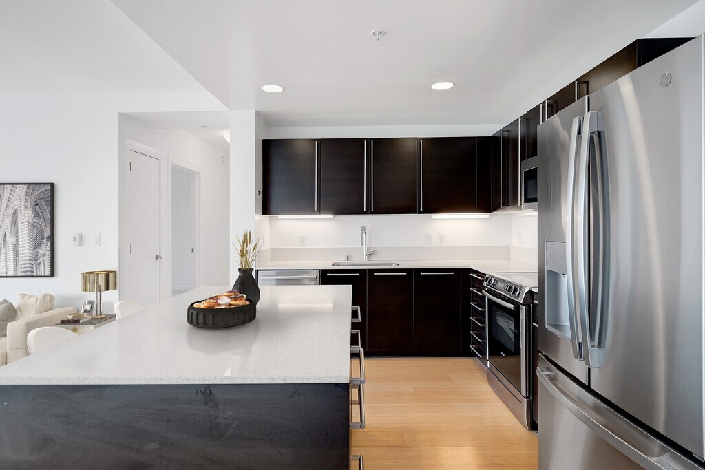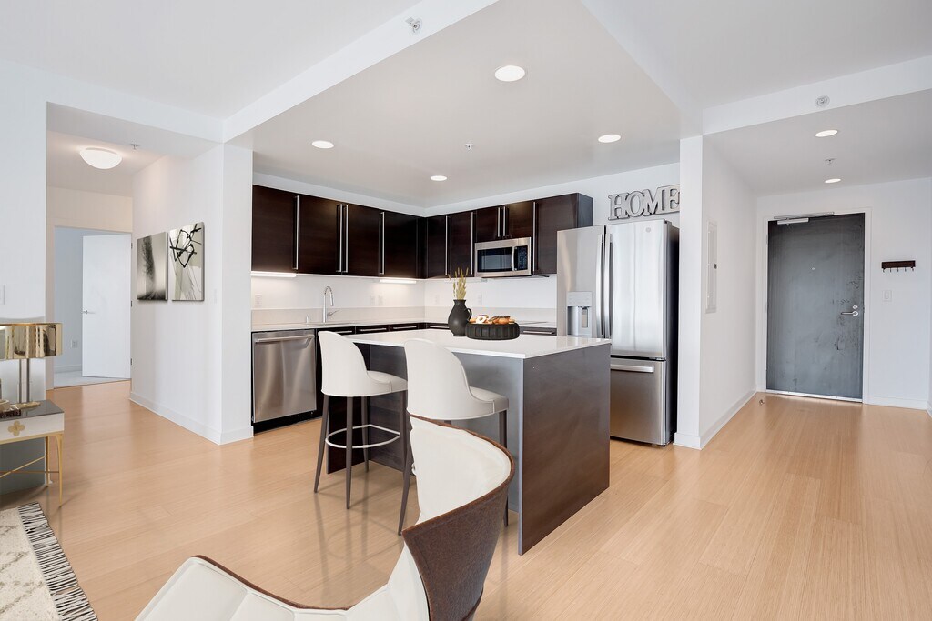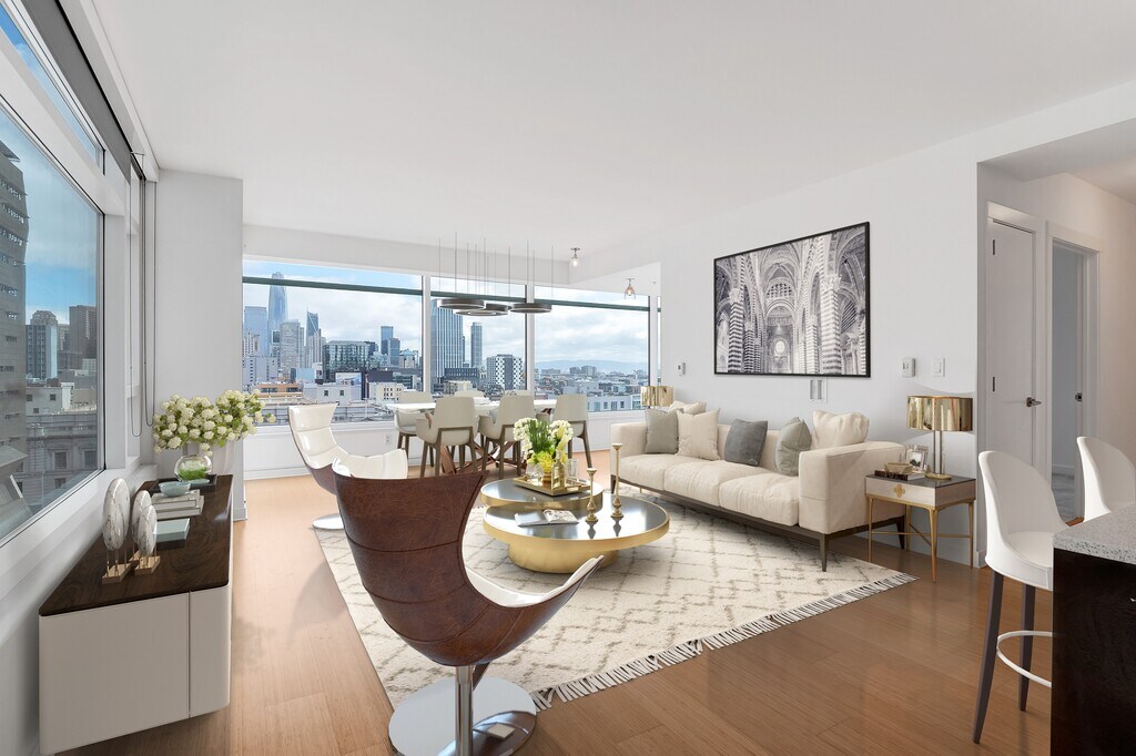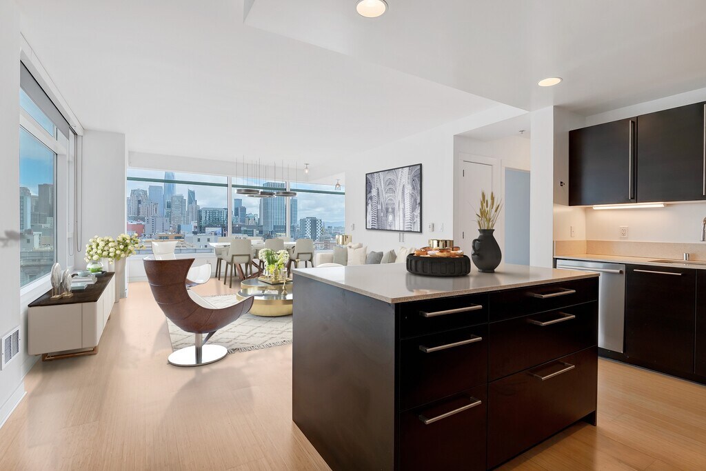 Experience breathtaking jetliner views of the San Francisco skyline from this stunning, modern, and technologically advanced high-rise condominium. Boasting 2 bedrooms and 2 full baths (including 1 en-suite), this luxurious unit offers a spacious open floor plan accentuated by expansive windows, flooding the space with natural light. The chef's kitchen, adorned with Bosch appliances, Studio Becker cabinetry, and Cambria quartz countertops, exudes elegance and functionality. Light wood floors add a touch of chic sophistication throughout. Relish in the comfort of the primary bedroom with its panoramic views of the San Francisco skyline and ample walk-in closet. The en-suite primary bathroom features a custom Studio Becker double vanity with quartz countertops and a luxurious walk-in shower. Indulge in resort-style living with an array of amenities including twice-monthly in-unit housekeeping, a fitness center, outdoor spa, lounge area with fire pit, dining area with built-in ! BBQ, community club room, 24-hour attended lobby, coffee bar, and additional guest parking all included in the HOA dues. Experience the epitome of modern urban living in this exceptional condominium.