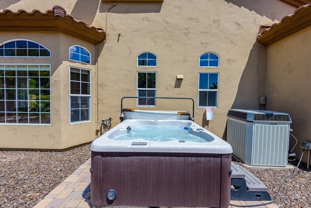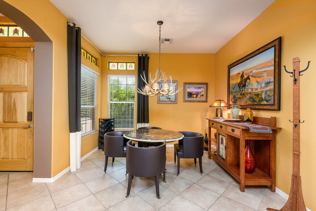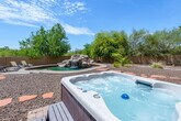 Nestled in the heart of Cave Creek, Arizona, this stunning home offers breathtaking views of Black Mountain and is just a short walk from the hiking trail. With 4 bedrooms and 3 bathrooms, this spacious residence features an open floor plan, a 2-car garage, and RV parking. Feel at home as you relax in the private resort-style pool with a tranquil waterfall, perfect for entertaining and enjoying the desert oasis. The home boasts a spacious open floor plan connecting the living room, dining room, gourmet kitchen, and family dining area. The kitchen is equipped with a high-end gas stove, stainless steel appliances, and a large bar area with seating for six. The master suite includes a king-size bed, a personal office, and a luxurious bathroom with dual vanities, a soaking tub, and a walk-in closet. Guest bedrooms offer queen beds and smart TVs, while the private guest suite features a king-size bed and direct pool access. The property allows one dog with prior approval and a non-refundable pet fee. No cats are allowed. The backyard features a resort-style pebble tech pool and an above-ground hot tub for relaxation. Located in the vibrant community of Cave Creek, this home is within walking distance to local attractions, art galleries, boutiques, restaurants, and nightlife. Enjoy a round of golf at the nearby Rancho Manana Golf Club or explore the scenic hiking trails just down the street. The pool cannot be heated, but guests can enjoy the outdoor heated spa. Free Wi-Fi is available throughout the home. Guests are liable for any damages caused to the property. A pet fee applies for bringing a dog, and no cats are allowed. The master suite includes a personal office with a library desk, office chair, and bookcase, providing a quiet space to work while enjoying the backyard scenery. A laptop computer is not included. [SI]