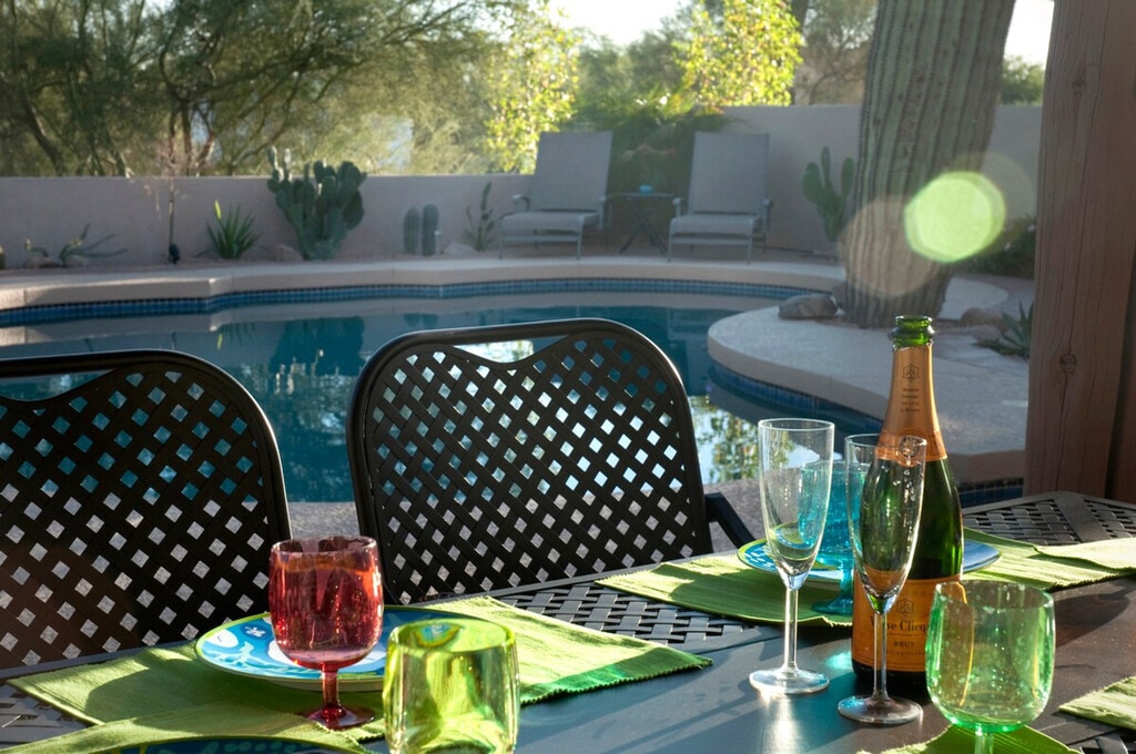 Feel at home in Casa Saguaro, a single-story home with 4 bedrooms and 2.5 baths, accommodating up to 10 guests. This home features flat-screen TVs in the family room, master bedroom, two guest bedrooms, and game room. The game room includes a TV viewing area, cocktail table, and pool table. Enjoy the stainless steel BBQ, outdoor dining, comfortable seating around the outdoor fireplace, and four lounge chairs by the pool and spa. All linens, bath, and pool towels are provided, along with complimentary Wi-Fi. An additional fee applies to heat the pool and/or spa, which is heated by a propane heater. Guests are responsible for the cost of propane used. Located north of Dynamite, between Scottsdale Rd and Cave Creek, this home is a short drive to North Scottsdale, Cave Creek, Desert Ridge, and City North of North-East Phoenix. Please note there is 1/4 mile of gravel road to get to the driveway. Guests are liable for any damages caused to the property. [SI]