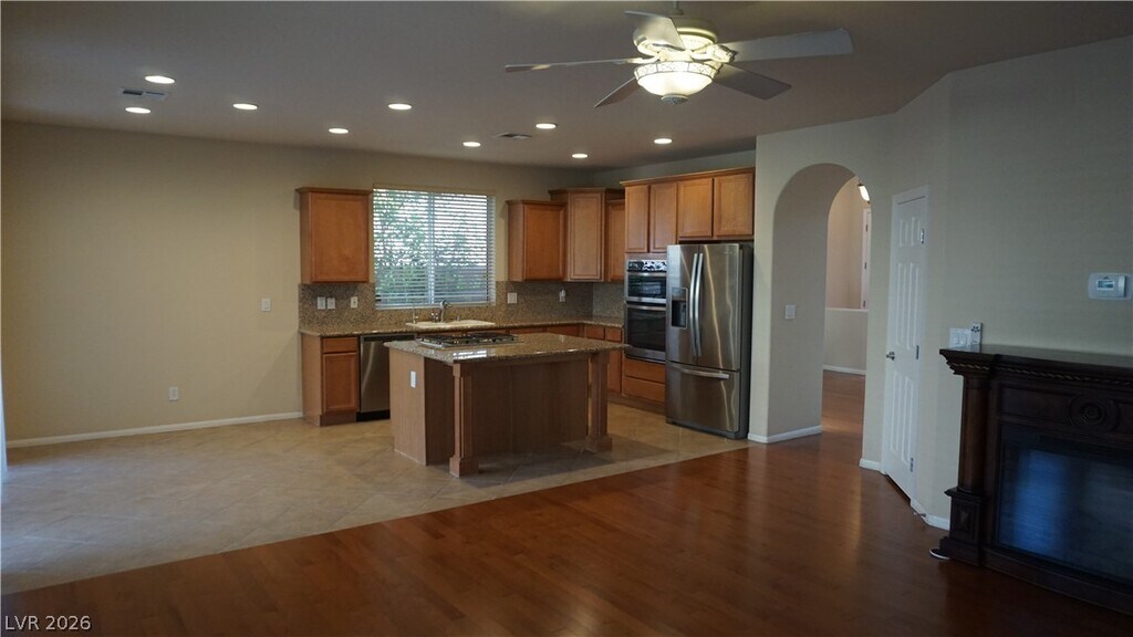 Superb Summerlin home in a gated community close to parks, schools, shopping and restaurants. Attached 2 car garage; tiled entry/foyer; wood flooring downstairs, bedrooms have carpet. Eat in kitchen with tile flooring, island, granite countertops, breakfast bar; formal dining room; separate family room with fireplace and media niche; vaulted ceiling; master bedroom on the second floor with walk in closet; master bath with double sinks, large shower, garden tub; secondary bedrooms on the second floor; laundry area in home; private backyard with a covered patio, and desert landscaping.