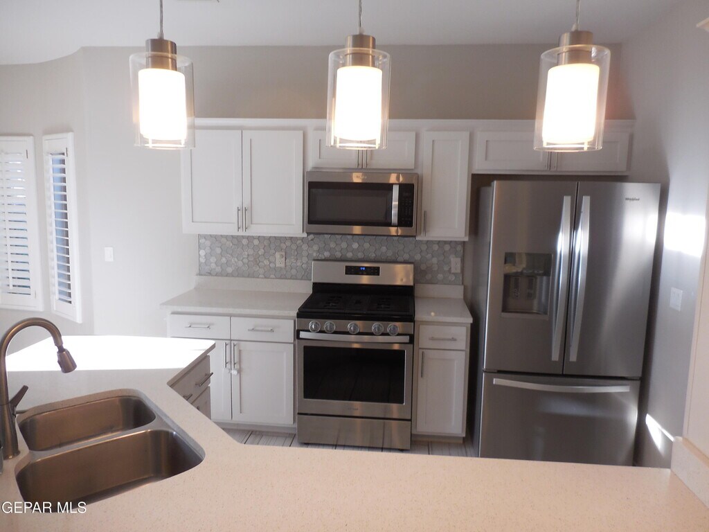 Discover this beautiful 3-bedroom,2.5-bath home located in a desirable West El Paso neighborhood near major shopping centers. With 1,659 sq ft of living space,this two-story home features ceramic tile throughout the main floor and cozy carpet upstairs. The kitchen comes fully equipped with a refrigerator,gas stove,microwave,and dishwasher. Washer and dryer are also included for your convenience. Enjoy modern comforts like refrigerated air,walk-in closets,and window shutters throughout the home. The backyard offers low-maintenance synthetic grass,minimal landscaping,and a covered patio perfect for relaxing or entertaining. Partially furnished if tenant wants.