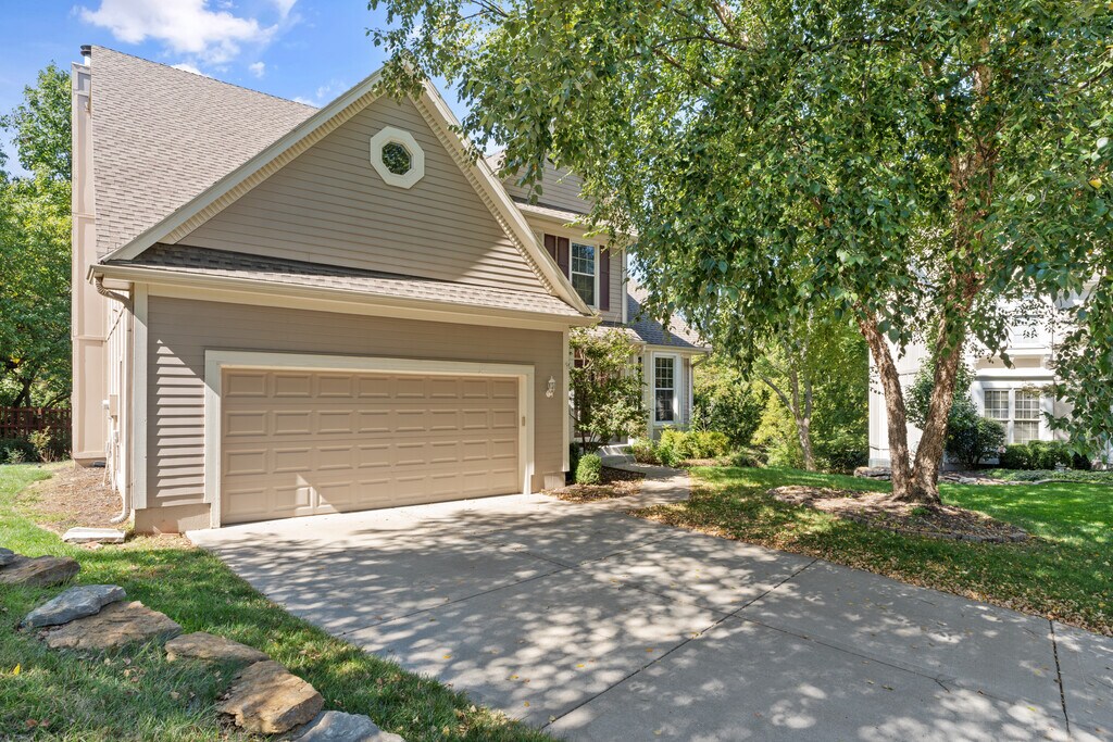 Fantastic 2 story in highly desirable Creekside subdivision, you will love this private location at the end of a cul de sac and bordering greenspace of Creekside Park. New carpet just installed upstairs, new LVT flooring in upstairs bathrooms, new designer carpet on stairs, spacious bedrooms and upstairs laundry, large formal living room, formal dining and family room with fireplace, hardwood floors in kitchen, breakfast dining, finished basement has daylight windows and full bath, fenced yard, large deck and mature landscaping. Don't forget about the Blue Valley Schools and close proximity to shopping, highways and more!!