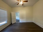 This vintage-style 3 bedroom, 2 bathroom home sits on a corner lot in downtown DeRidder, close to shopping and local amenities, with an easy 25-minute commute to Fort Polk. The property has a fenced yard and large shade trees, plus a spacious front porch. Inside, the home has vinyl flooring throughout, with carpet in the primary bedroom. High ceilings and ceiling fans add comfort. The kitchen is large and recently updated, featuring stainless steel appliances, plenty of cabinet space, an eat-in area, and enough room for a portable island. The primary bedroom includes a wall of windows, a walk-in closet, and a private bathroom with dual sinks, cabinet storage, and a tub/shower combo. The two secondary bedrooms share a Jack-and-Jill style bathroom with another tub/shower combo and a large vanity with additional storage. A dedicated laundry room offers washer/dryer hookups and more cabinet space. The fenced backyard completes the property, providing a practical outdoor area.