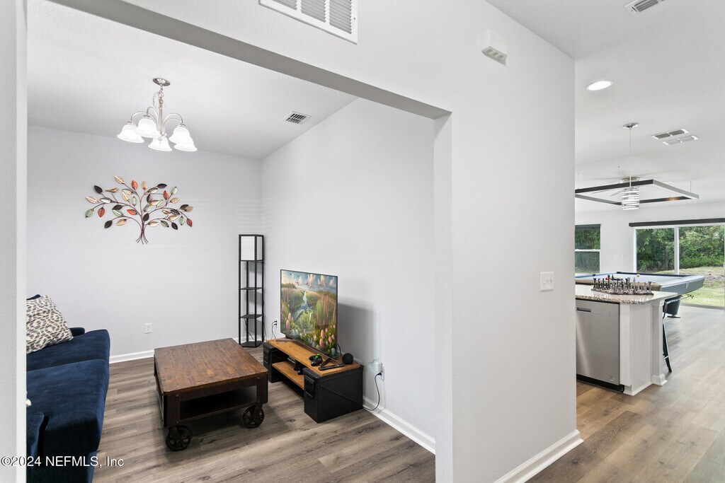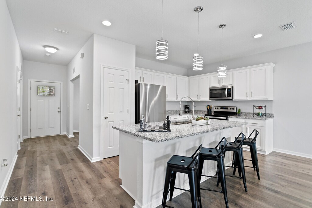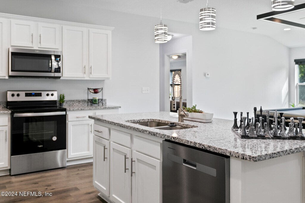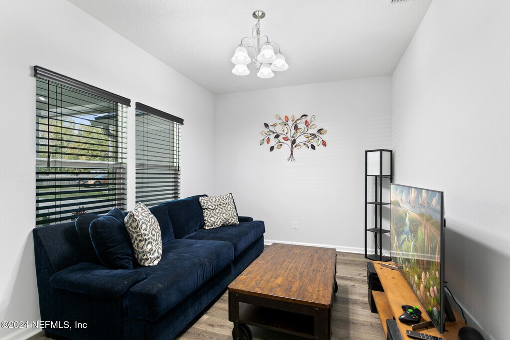 Experience this exceptional,nearly new home nestled in the desirable Ortega Farms neighborhood! Offering over 1,800 sq. ft. of thoughtfully designed living space,this 4-bedroom,2-bath residence features a sought-after split floor plan that blends functionality with modern comfort.Inside,you'll find elegant vinyl plank flooring throughout,a formal dining room,and a spacious living areaperfect for gatherings and everyday living. The chef-inspired kitchen is a true highlight,featuring granite countertops,stainless steel appliances,recessed and pendant lighting,and an open-concept design that flows seamlessly into the living room.Both bathrooms are beautifully upgraded with granite countertops,sleek tile flooring,and fully tiled showers for a spa-like feel. Additional upgrades include custom-installed blinds throughout and a whole-home water softener system,adding both comfort and convenience. MLS# 2113720