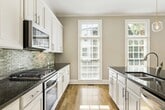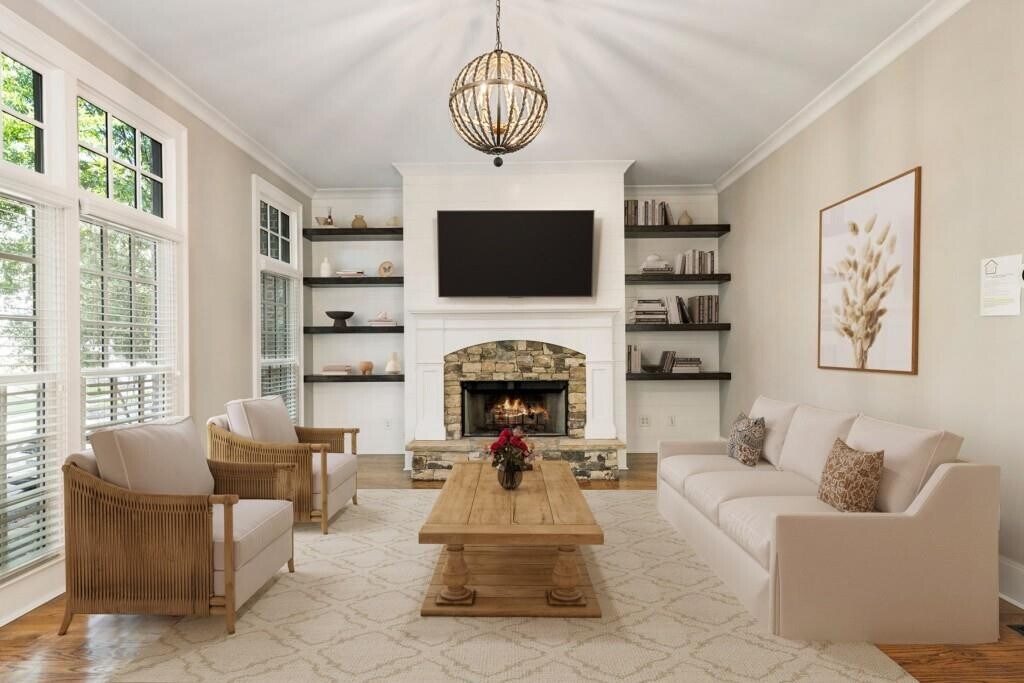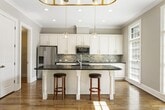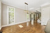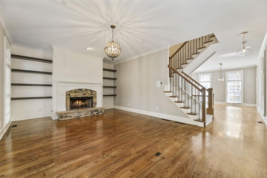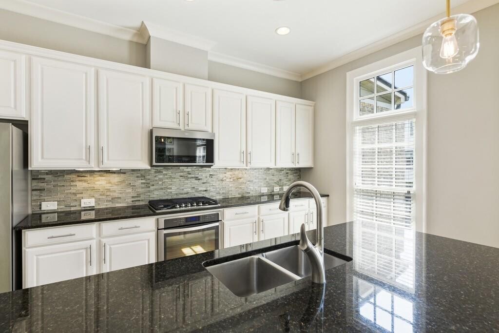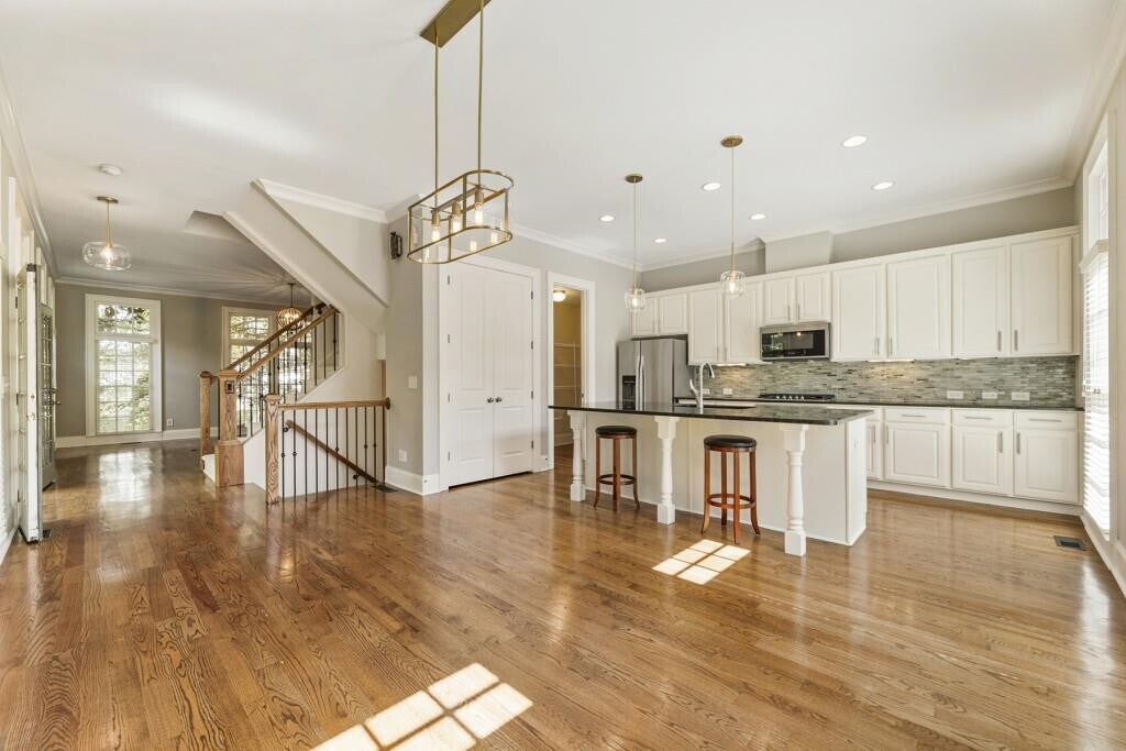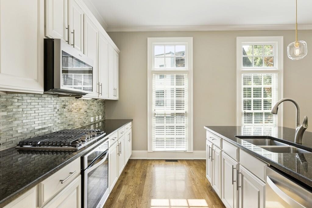 Vickery presents an exceptional end-unit townhome with elegant three-sided brick construction,3 bedrooms and 3.5 baths,all just steps from the community's shops,dining,and amenities. Enter through the welcoming front door or the convenient two-car garage into a private lower-level bedroom suite complete with a full bath ideal for guests,teens,or a home office. Upstairs,a landing with a well-placed half bath leads into the main living level. The heart of the home is a spacious great room,featuring a beautiful fireplace flanked by custom built-ins. The open dining area flows naturally into the chef's kitchen,designed with a large island and breakfast bar,two pantries,stainless steel appliances,abundant white cabinetry,and gleaming granite countertops. From the living area,step out onto the balcony,a perfect spot for morning coffee or evening relaxation. The upper level hosts the expansive owner's suite,offering a luxurious bath with double vanities,a soaking tub,and a generous walk-in closet. A second private ensuite bedroom and a well-appointed laundry room complete this floor. Hardwood floors extend throughout the main and upper levels,enhancing the home's warmth and sophistication. Located in one of the most picturesque communities in the region,Vickery offers an unmatched live-work-play lifestyle with 75 acres of green space,six tennis courts,six pickleball courts,a resort-style pool with cabanas,two fishing ponds,walking trails,a brand-new playground,outdoor basketball court,fire pit,and a robust calendar of community events.