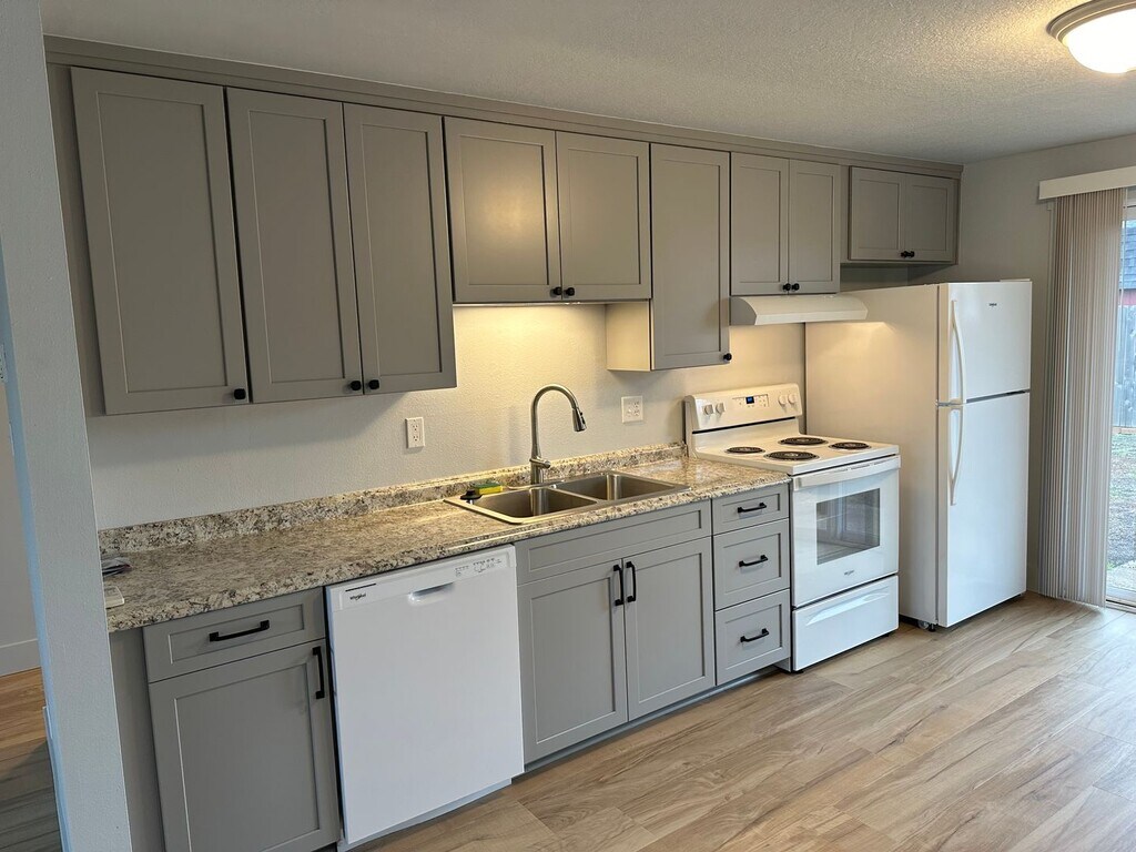 This updated Springfield duplex is in a really great neighborhood in desirable Thurston, close to Thurston High, Thurston Middle, and Ridgeview. Large windows provide lots of natural light! Kitchen opens in to the living room! Sliding glass door goes out to the private fenced back yard and concrete patio area. Perfect for the BBQ! LVP flooring throughout! Ductless heat pump with AC! Fresh paint! New blinds! Kitchen has custom cabinets and countertops! Extra closets in the hallway for additional storage. Bathroom off the hallway. Brand new bathroom! New tub and shower surround, new toilet, new mirror and a new vanity! Both bedrooms have large closets and ceiling fans! Finished single car garage with washer and dryer hook ups. NO pets and NO smoking (cigarettes, marijuana, e-cigarettes) at all on the premises. This house won't last long! Call today for a showing or visit our website to apply! / Application required for each person 18+. $45/non-refundable application fee if we run your application. Tenants have the right to a refund if the landlord fills the unit before screening the applicant or the applicant withdraws the application in writing prior to the screening being conducted. First full months' rent and security deposit due at move-in.