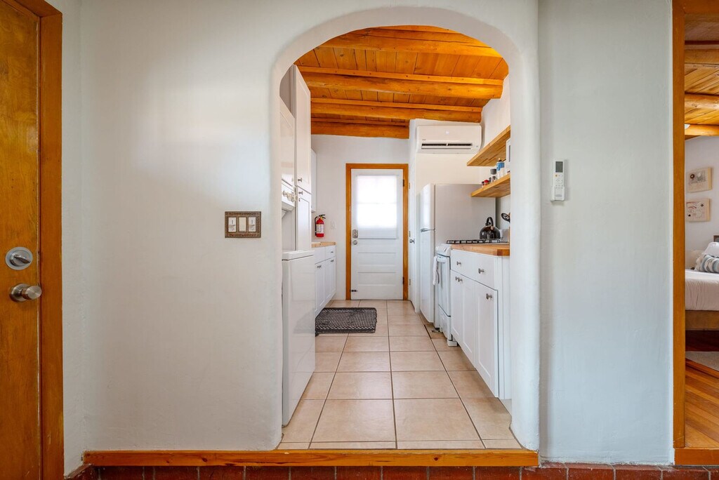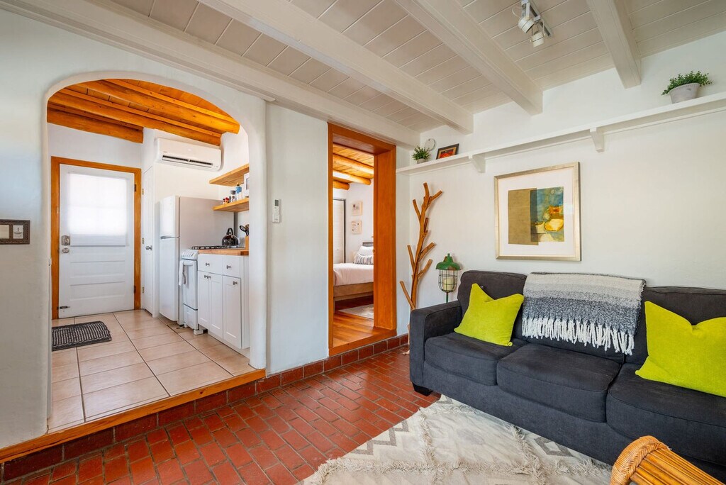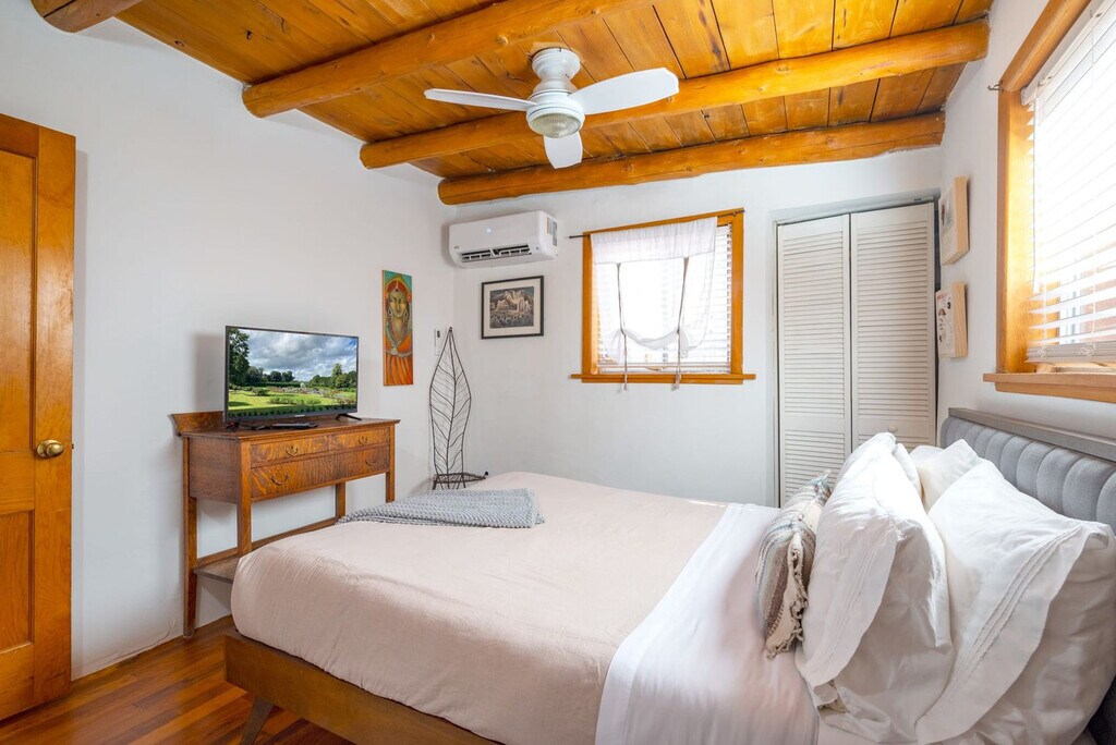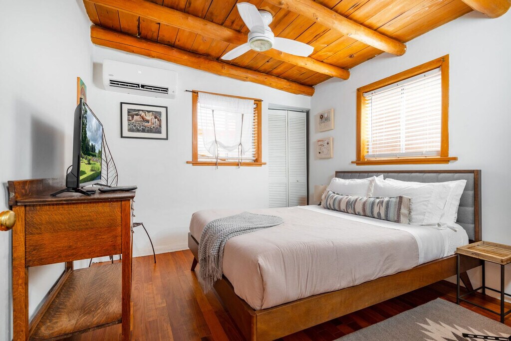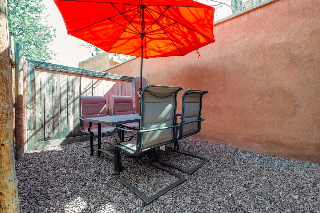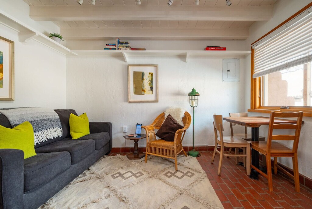 Nestled less than a mile from the plaza, this charming casita offers a private courtyard with a grill, making it an ideal retreat for singles or couples. Recently updated with a remodeled bathroom, this cozy space exudes a refreshing and artistic ambiance, inviting you to feel at home. Featuring wood, brick, and tile floors, wooden vigas, and authentic adobe walls, this quintessential Santa Fe casita captures the essence of the region. The private courtyard, complete with seating and a BBQ grill, allows you to savor the delightful Santa Fe weather. Enjoy meals at the dining nook in the front room or at the patio table in the courtyard. The fully equipped kitchen makes home cooking a breeze, and the living room sofa bed is perfect for accommodating a little one. Reliable Wi-Fi and free private parking ensure a carefree stay. For those using the sofa bed, extra linens can be provided for a $25 fee for groups smaller than three. Baby equipment is available on a first-come, first-served basis for an additional fee. The local neighborhood and the city of Santa Fe are brimming with attractions. The Railyard District, a hub of arts and entertainment, offers galleries, performance spaces, and restaurants. The Santa Fe Plaza, just 0.7 miles away, is home to historical and artistic sites like the Georgia O’Keeffe Museum and the Loretto Chapel. Canyon Road, a mile away, boasts numerous galleries and dining options. For outdoor enthusiasts, the Santa Fe Ski Basin is a short drive away, and various hiking trails are nearby. Downtown Santa Fe is easily navigable on foot, with additional options like the Santa Fe Pickup Shuttle and Santa Fe Trails Bus Service available for convenient travel. Quiet hours are from 10:00 PM to 6:00 AM, with outdoor quiet time starting at 9:00 PM. Smoking indoors is prohibited, and a $500 cleaning fee will be charged if smoking occurs inside. Pets are not allowed, and a $300 cleaning fee will be charged if evidence of a pet is found. Parking is available for one vehicle in a studio or one-bedroom house and two vehicles in a two or more bedroom house, with designated parking areas only. Check-in and check-out times are specified in the house manual, and a late check-out fee of $40 per hour may apply if it interferes with the next guest's check-in time. Registration Number: STR227429