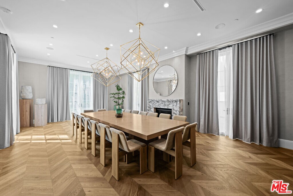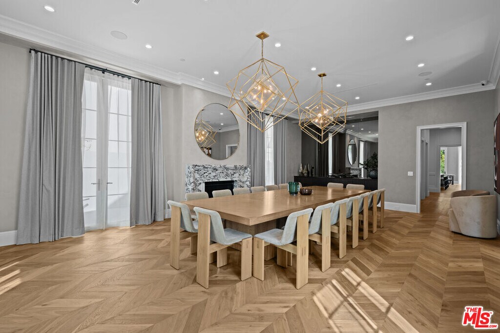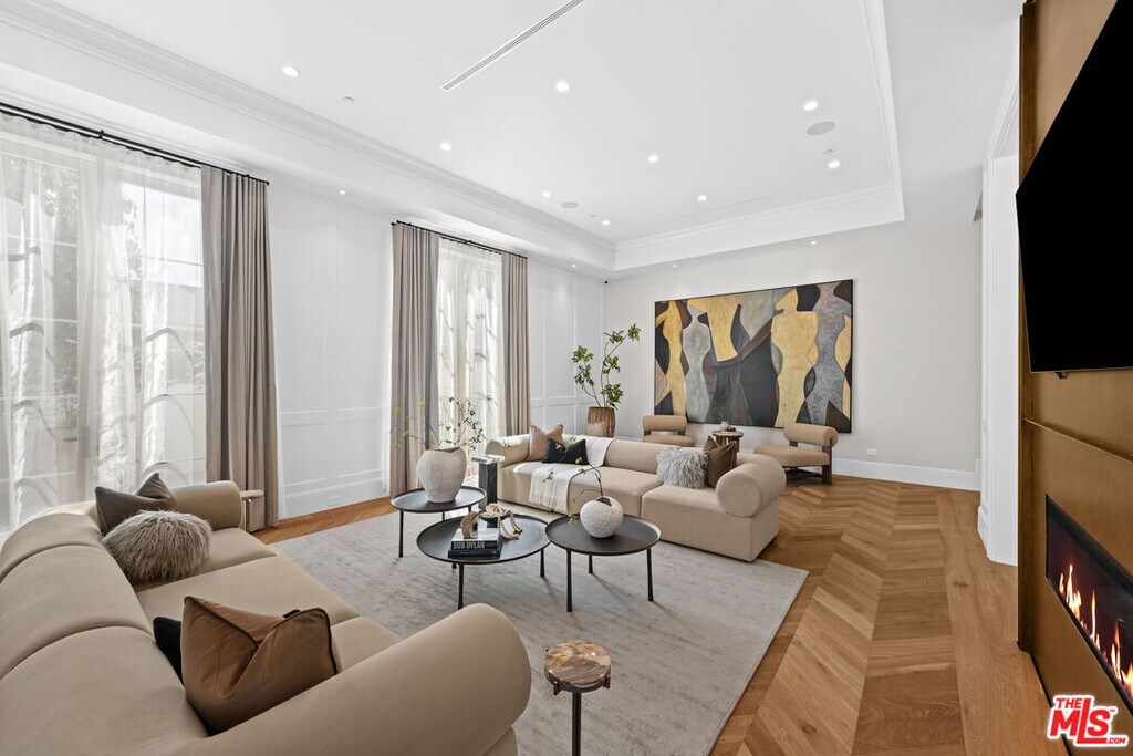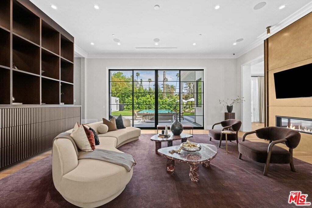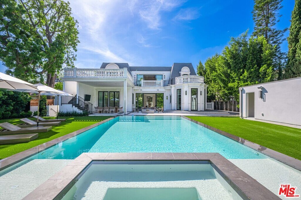 Newly built and fully furnished, this extraordinary Beverly Hills estate spans over 14,000 square feet across three levels, offering 8 bedrooms, 12 bathrooms, a private elevator, and a gated subterranean 10-car garage. A dramatic bridge entry creates a striking sense of arrival, while also allowing natural light to cascade into the lower level below. Defined by architectural elegance and exceptional custom craftsmanship, the home features select white oak flooring, Venetian plaster walls, bespoke lighting, a grand staircase, and a dramatic skylight. The formal dining room and showpiece kitchen are finished in exquisite Calacatta Viola stone, with the kitchen further appointed with Sub-Zero refrigeration, Wolf appliances, a Waterstone faucet, and custom cabinetry throughout. Thoughtfully designed for both refined entertaining and comfortable daily living, the residence includes a formal living room with bar, a den with a see-through fireplace, a richly finished paneled office, theater, and expansive lower-level entertainment spaces. All eight bedrooms offer en-suite baths and closets, including a stunning primary suite with dual bathrooms, dual walk-in closets, and a large private patio. Outdoors, a beautifully symmetrical infinity pool and jacuzzi align with the home's central axis, complemented by an outdoor fireplace and beautifully designed terraces. With a second pool and jacuzzi on the lower level, curated furnishings, original art, and bespoke finishes throughout, this is a rare offering of scale, warmth, and modern luxury in one of Beverly Hills' most coveted settings. MLS# 26710737