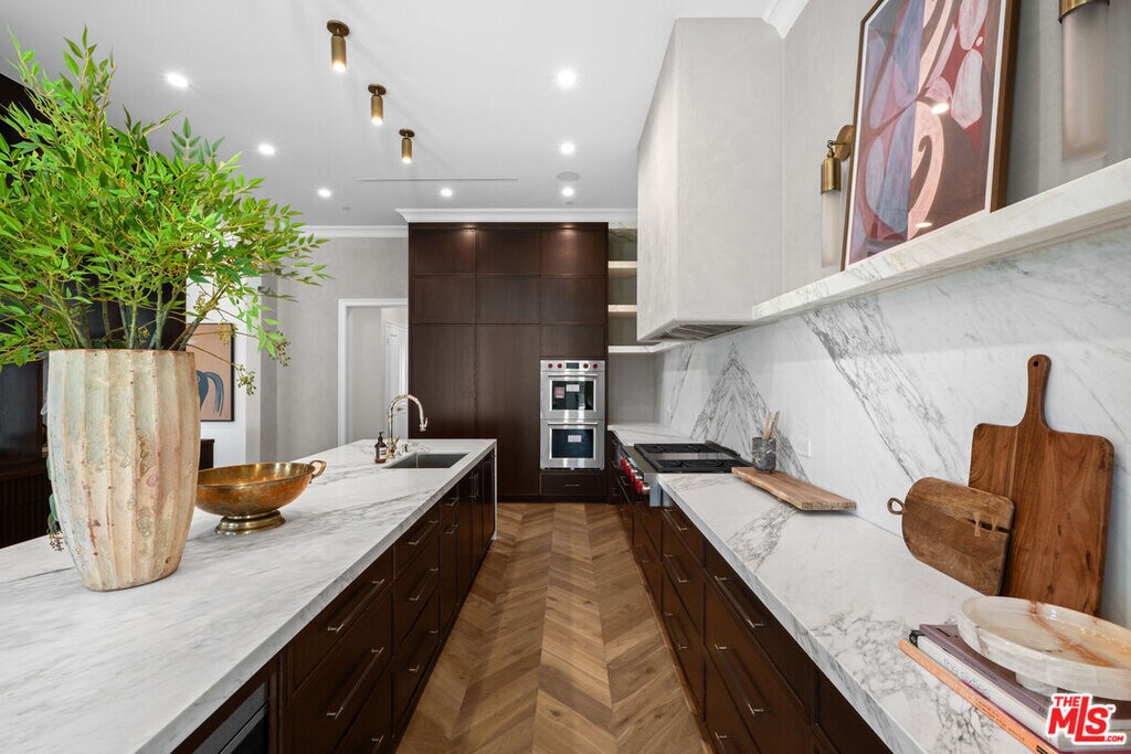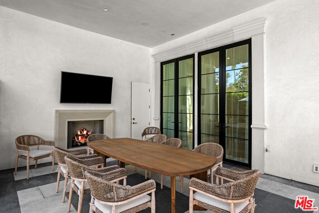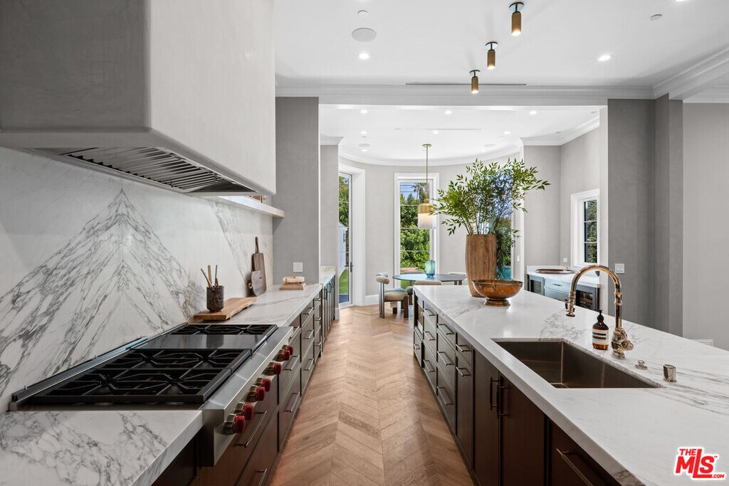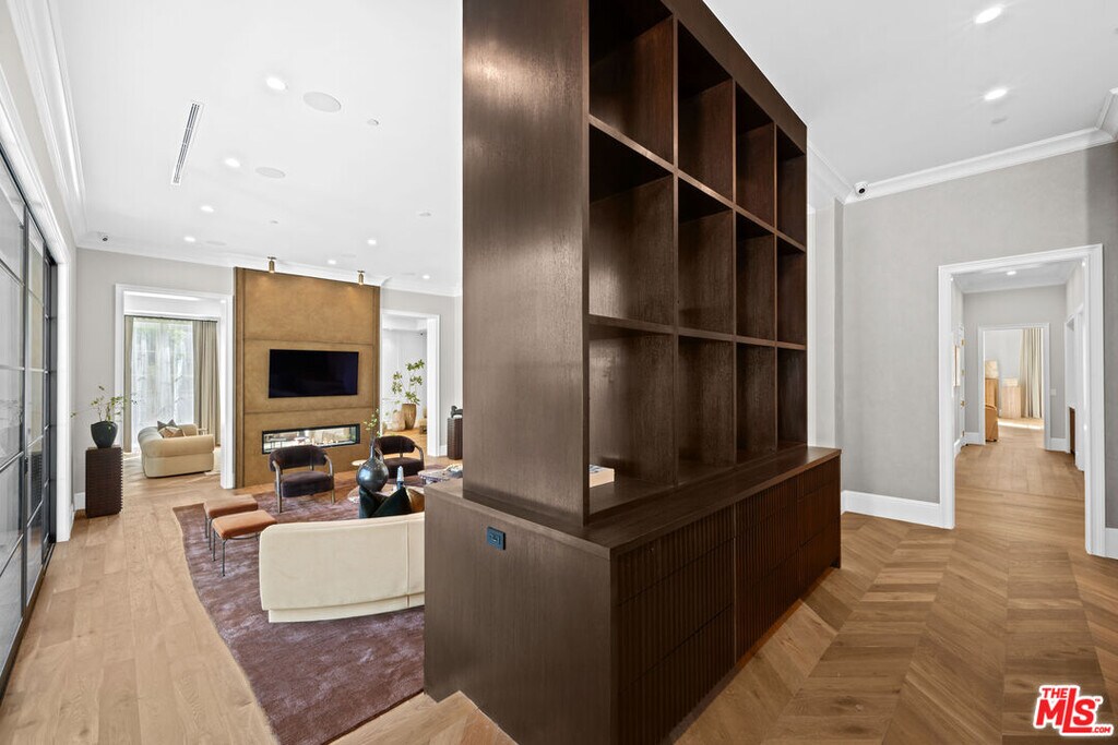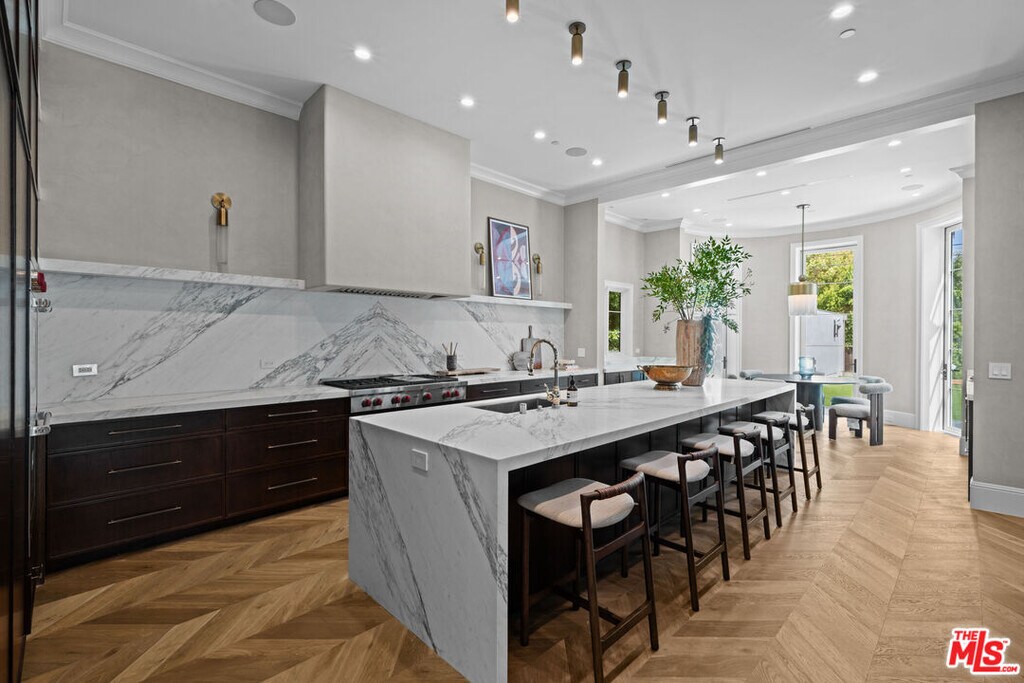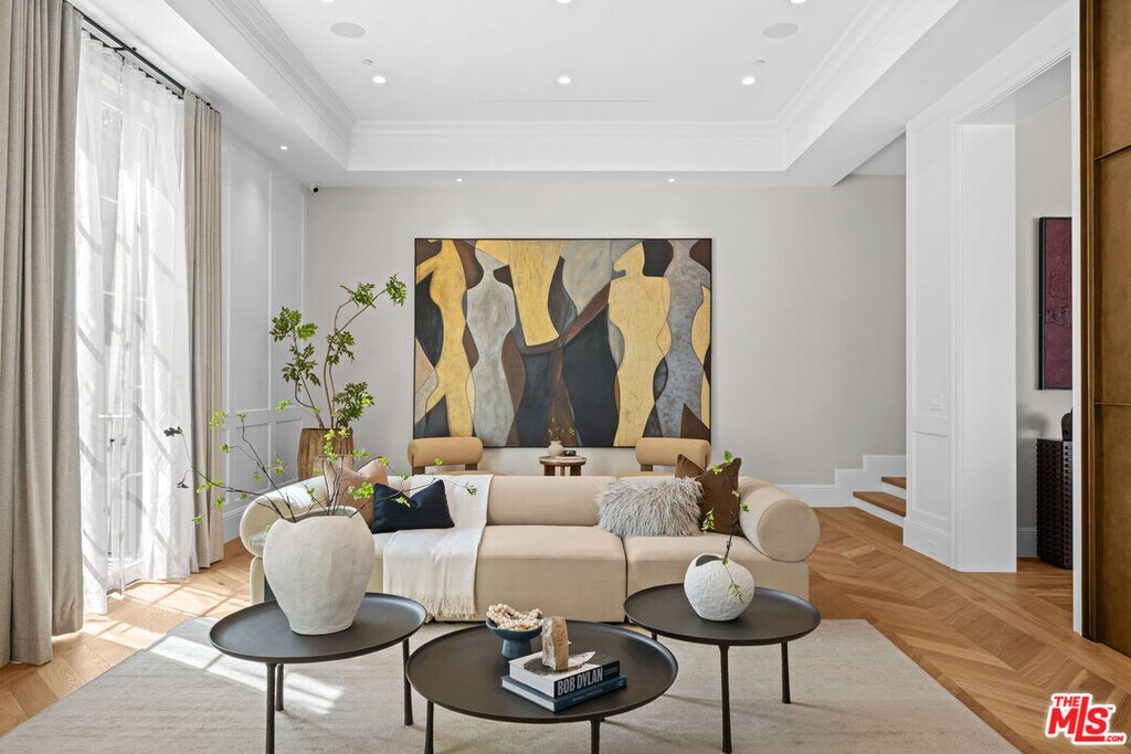 Newly built and fully furnished, this extraordinary Beverly Hills estate spans over 14,000 square feet across three levels, offering 8 bedrooms, 12 bathrooms, a private elevator, and a gated subterranean 10-car garage. A dramatic bridge entry creates a striking sense of arrival, while also allowing natural light to cascade into the lower level below. Defined by architectural elegance and exceptional custom craftsmanship, the home features select white oak flooring, Venetian plaster walls, bespoke lighting, a grand staircase, and a dramatic skylight. The formal dining room and showpiece kitchen are finished in exquisite Calacatta Viola stone, with the kitchen further appointed with Sub-Zero refrigeration, Wolf appliances, a Waterstone faucet, and custom cabinetry throughout. Thoughtfully designed for both refined entertaining and comfortable daily living, the residence includes a formal living room with bar, a den with a see-through fireplace, a richly finished paneled office, theater, and expansive lower-level entertainment spaces. All eight bedrooms offer en-suite baths and closets, including a stunning primary suite with dual bathrooms, dual walk-in closets, and a large private patio. Outdoors, a beautifully symmetrical infinity pool and jacuzzi align with the home's central axis, complemented by an outdoor fireplace and beautifully designed terraces. With a second pool and jacuzzi on the lower level, curated furnishings, original art, and bespoke finishes throughout, this is a rare offering of scale, warmth, and modern luxury in one of Beverly Hills' most coveted settings. MLS# 26710737