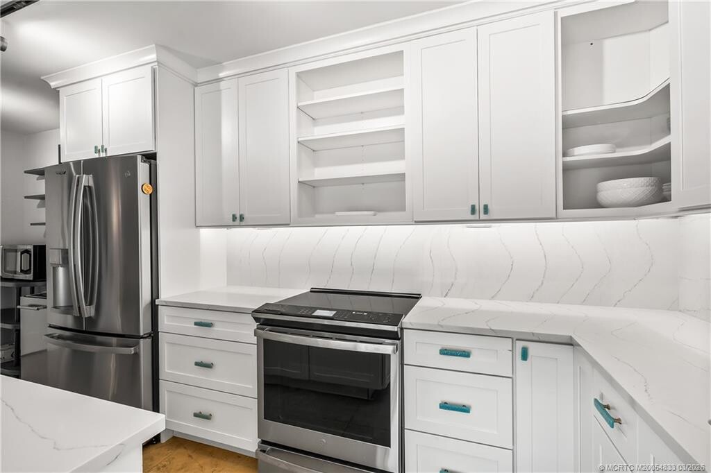 The current owner has spared no expense on this stunning,remodeled townhome in River Pines. Remodeled kitchen features quartz countertops,stainless steel appliances,shaker cabinets,and a large island. Bathrooms have been completely renovated with custom cabinetry,new lighting,and quartz counters. Additional improvements include luxury vinyl plank flooring,cable stair railing system,all new ceiling fans,impact sliders,tankless hot water heater,whole-house water filtration system,and under-sink reverse osmosis system. Electric blinds on all sliders for light filtration and privacy. 2023 roof,2024 AC. River Pines is located on the shores of the Intracoastal- just 10 minutes to downtown Stuart or I-95,and a quick bike ride to dining in Port Salerno. Amenities including tennis,pickleball,& 2 heated pools. Community boardwalk through the mangroves leads to a fishing pier and kayak/paddleboard launch area. Pet friendly community and all ages welcome! MLS# M20054833