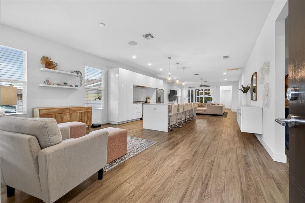 Available for a 12 month lease,this fully furnished 2019-built home is one of the best rental options on the market. Situated on a quiet brick-paved street in a NON FLOOD ZONE,the home is just minutes from downtown St. Petersburg,shopping,dining,and the beaches,making it easy to enjoy everything the area has to offer. Inside,you’ll find a bright,open floor plan where the kitchen,dining,and living areas flow seamlessly together. The kitchen truly serves as the heart of the home where the massive island is the showstopper featuring custom cabinetry,quartz countertops,stainless steel appliances,a built-in microwave,and a wine refrigerator. Luxury vinyl plank flooring runs throughout. Open floor plan - living room has a triple sliding glass doors to one of the best features of the home,a beautifully designed screened-in outdoor living space. The pavered backyard area includes a built-in grill,refrigerator,and ice maker,creating the perfect spot for hanging out or hosting friends. The primary bathroom offers a custom vanity with quartz countertops and additional storage for linens. You’ll also appreciate the spacious laundry room with custom cabinetry and a deep utility sink,plus an insulated two-car garage and water softener. Fully furnished. Minimum 12-month lease required. NO PETS. MLS# TB8483417