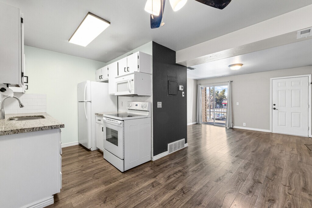 Welcome to this lovely Murray condo, now available for rent! This 1-bedroom, 1-bathroom unit is located on the 2nd floor and offers a bright, inviting living space with stylish laminate flooring and an open layout that flows seamlessly into the kitchen perfect for both everyday living and entertaining. The kitchen features crisp white cabinetry, granite countertops, a classic subway tile backsplash, and modern floating shelves, creating a clean and contemporary feel. Just off the kitchen, you'll find a comfortable dining area with a ceiling fan, ideal for casual meals or hosting guests. The oversized bedroom provides a relaxing retreat with plenty of space and a large walk-in closet. The bathroom is well-appointed with a granite vanity, undermount sink, tile flooring, and a full tub/shower. Step outside to your private patio perfect for enjoying a morning coffee or unwinding at the end of the day with additional storage for your convenience. This unit includes one covered parking space and access to great community amenities, including a pool, gym, clubhouse, tennis courts, and on-site laundry facilities. Located in a prime Murray area near Fort Union, you'll be just minutes from shopping, dining, entertainment, and have easy freeway access. The owner will cover the cost of the HOA, which includes water, sewer, and trash. Tenants will be responsible for gas, power, Wi-Fi, and renter's insurance. No Smoking Allowed. One (1) dog, two (2) cats, or (1) of each are permitted as pets. Only two (2) pets total are allowed. Rent: $1,200/month 1 Bed | 1 Bath | 2nd Floor Covered Parking Included On-Site Laundry | Pool | Gym The owner will cover the cost of the HOA, which includes water, sewer, and trash. Tenants will be responsible for gas, power, Wi-Fi, and renter's insurance. No Smoking Allowed. One (1) dog, two (2) cats, or (1) of each are permitted as pets. Only two (2) pets total are allowed.