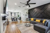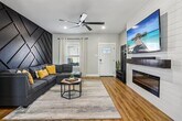 This warm contemporary home has been meticulously maintained and offers a move-in-ready living experience with no updates needed. Thoughtful architectural details set this home apart, including origami accent walls in the living room and stairwell, a shiplap feature wall framing the electric fireplace, and sleek black hardware throughout. Anderson windows and doors invite natural light into every space, highlighting the airy interior and 5-inch light LVP plank flooring. The kitchen is designed for both style and function, featuring grey granite countertops, Samsung stainless steel appliances, soft-close cabinets, and a pantry for convenient storage. A recently installed coat and shoe rack at the entrance complements the modern aesthetic and adds practical organization. A half bath is conveniently located on the first floor under the staircase. All bedrooms are located on the third floor, providing a quiet retreat from the main living areas. The primary suite includes an ensuite bathroom with a spacious closet, dual sinks set in a 60-inch Carrera-style countertop, and modern black hardware. All bathrooms in the home have been updated within the last year. Carpet is located upstairs, adding warmth and comfort to the private living spaces. The second floor features a dedicated laundry room, adding convenience to the home’s layout. The backyard offers a generous fenced-in space with lush grass, perfect for outdoor enjoyment. A 10x24 concrete open patio sits just off the kitchen, providing the ideal space for relaxing while watching kids play on the included wooden playground. A 10x10 Tuff Shed provides additional storage, and the one-car garage ensures secure parking. Major systems are in excellent condition, with a three-year-old roof, a six-year-old Trane AC, and a six-year-old Rheem hot water heater. This home is a seamless blend of modern style and everyday comfort. With high-quality finishes and a thoughtful layout, it is truly move-in ready.