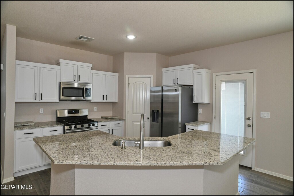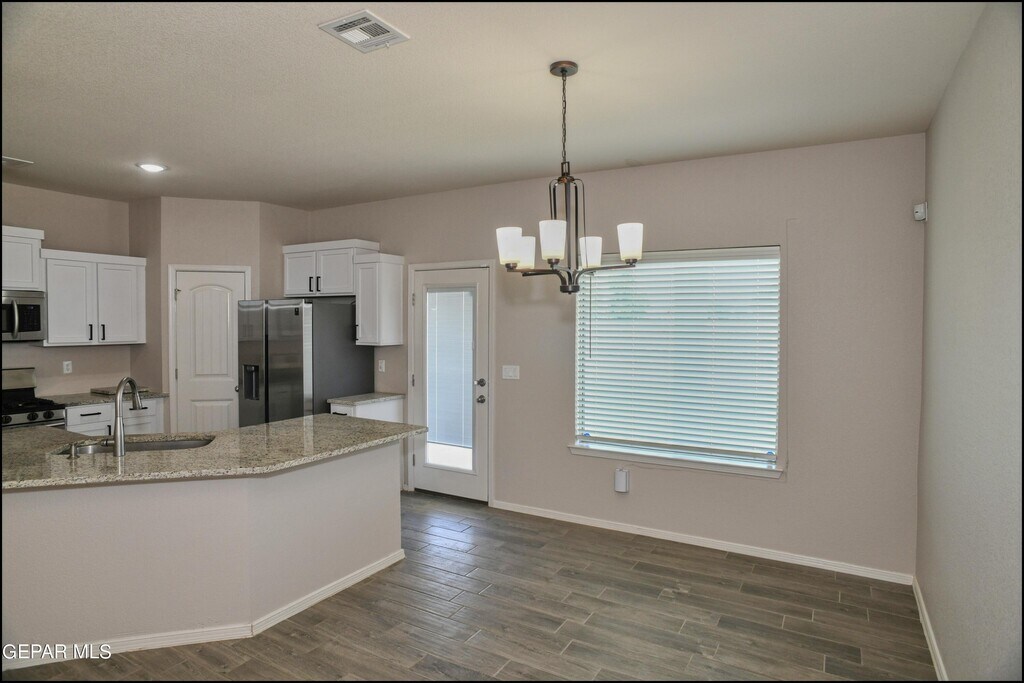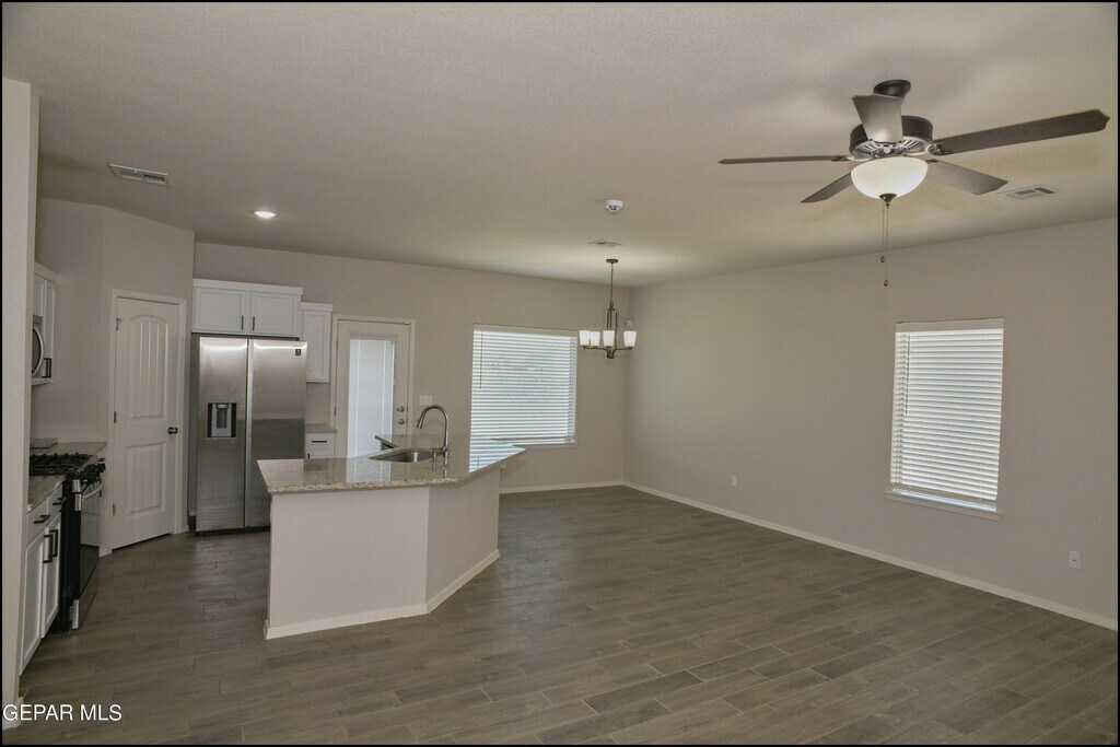 Stunning and well-maintained 3-bedroom,2-bathroom home,nestled in a peaceful cul de sac with a large backyard,ensuring privacy. The home's pleasing finishes and light color scheme create a welcoming environment,enhanced by simple yet elegant granite countertops throughout. The unique farmhouse-style exterior adds a touch of charm,while the open-plan living,dining,and kitchen area,complete with a large island and stainless steel appliances,allows for easy entertaining. The master bedroom comes with an ensuite bathroom for added convenience. The expansive backyard,complete with a patio,brick fire pit,and landscaping,offers ample outdoor space.