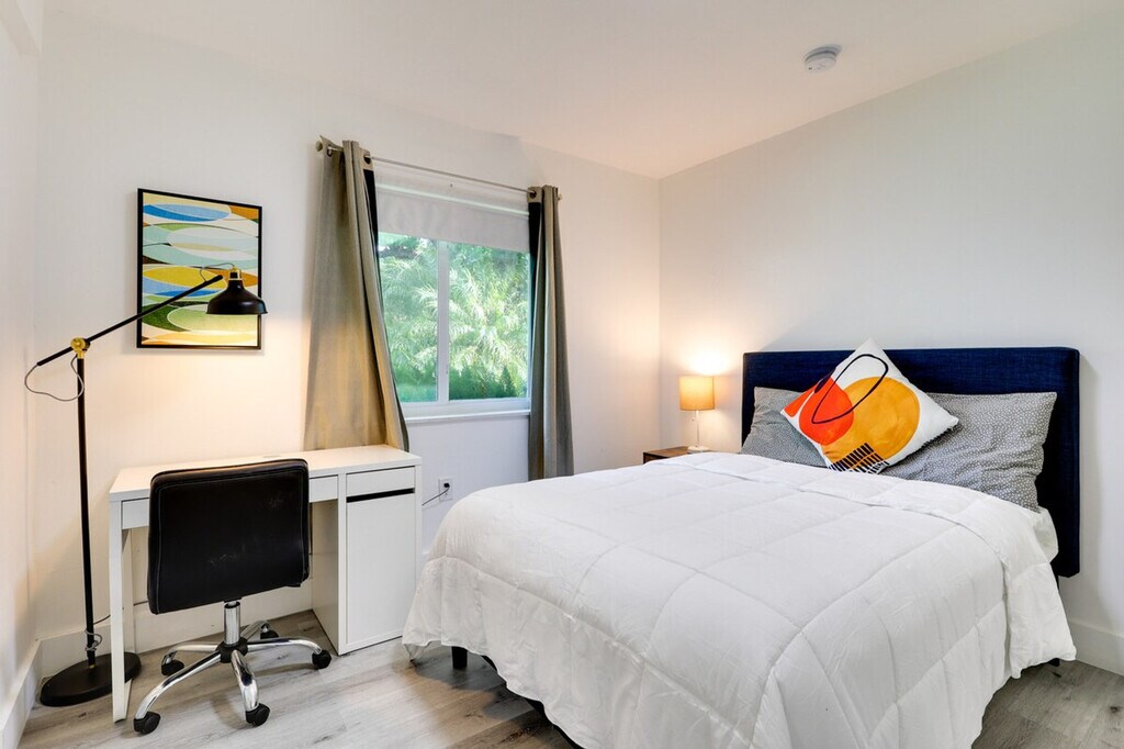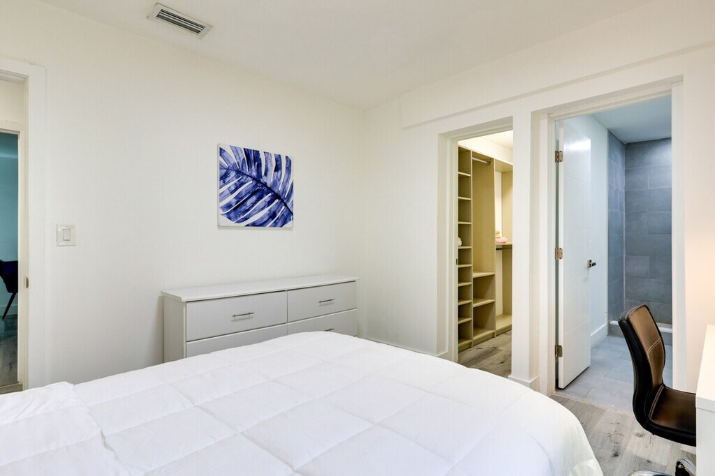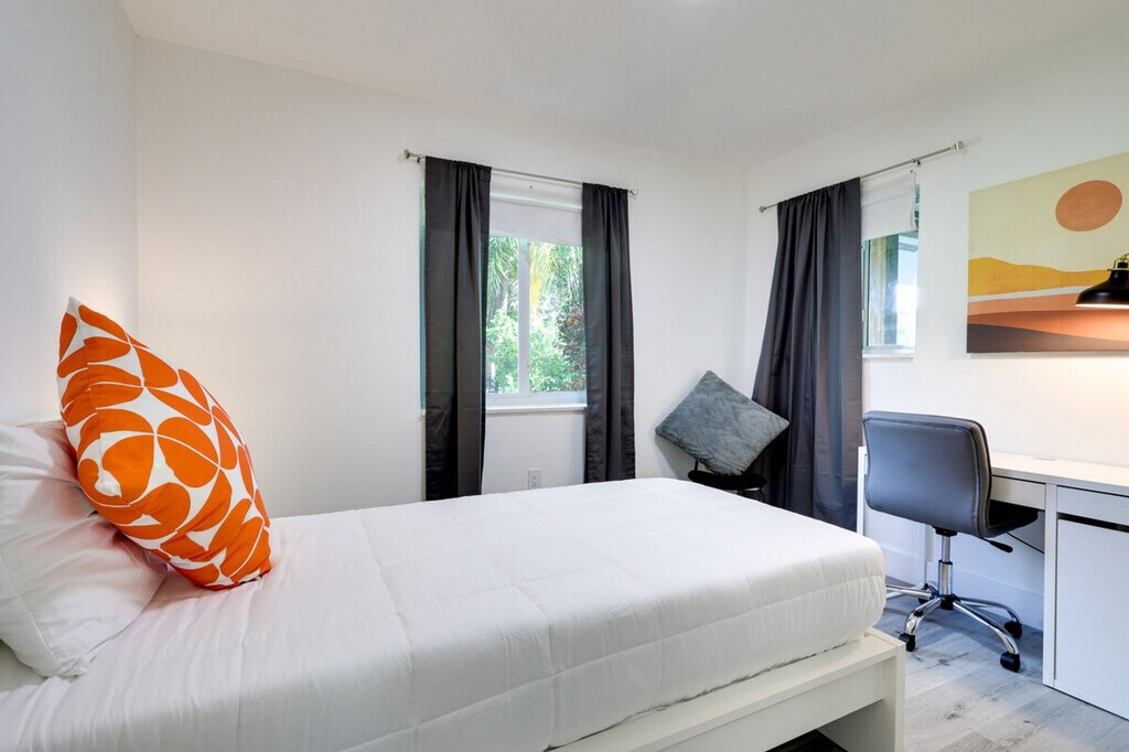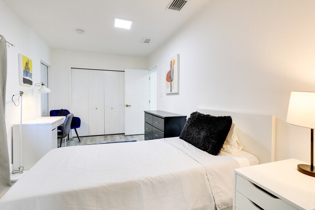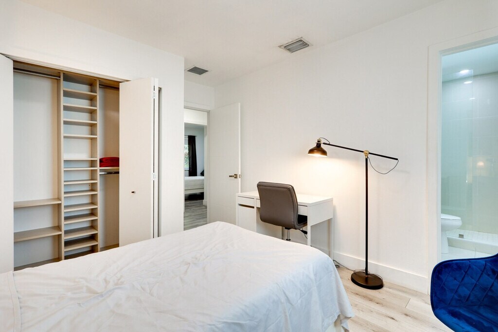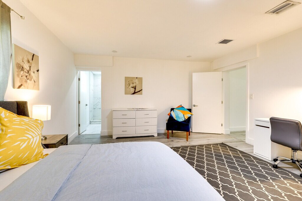 Make exploring the city a breeze when you stay at this South Miami vacation rental. With en-suite bathrooms in four of five bedrooms, a work-from-home desk in every room, and 3,500 square feet of space, this 5-bedroom, 5-bathroom home offers a place for the whole crew while still giving everyone plenty of peace and privacy. This Miami getaway may feel secluded when you’re relaxing under the trees on the gated lot, but there are plenty of shops and entertainment close by and a Metrorail station within walking distance. This spacious home is pet-friendly with a fee and features five work-from-home desks, making it ideal for remote work. The gated property spans 3,500 square feet and includes a smart TV, dining table, breakfast area, en-suite bathrooms, and walk-in closets. The outdoor space boasts a private yard, patio, gas grill, dining area, and garden. The kitchen is fully equipped with cooking basics, dishware, flatware, a dishwasher, refrigerator, stove, and microwave. Pets are welcome with a $50 fee plus additional fees and taxes. Parking is available on gravel driveways for up to seven vehicles and on a first-come, first-served basis on the street. RV and trailer parking is also available. Located in South Miami, this home offers easy access to shops, entertainment, and a Metrorail station within walking distance, making it convenient for exploring the city. This single-story home requires two steps to enter and features keyless entry for convenience. The property has a no-smoking policy and prohibits events, parties, or large gatherings. For your safety, there are four exterior security cameras facing out from the corners of the home, recording video and sound when activated by motion. A photo ID may be required upon check-in. Each bedroom is equipped with a work-from-home desk, providing a comfortable and productive environment for remote work. Free WiFi is available throughout the home. [SI]
