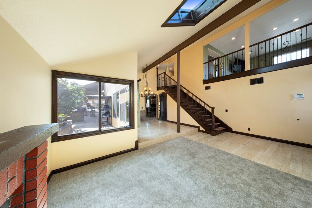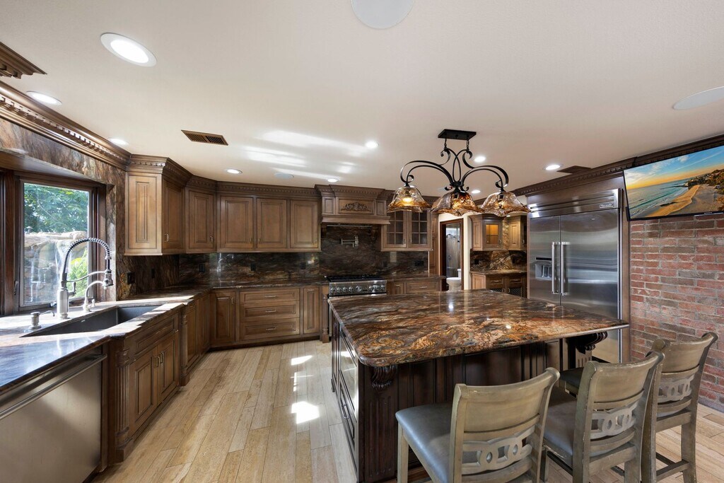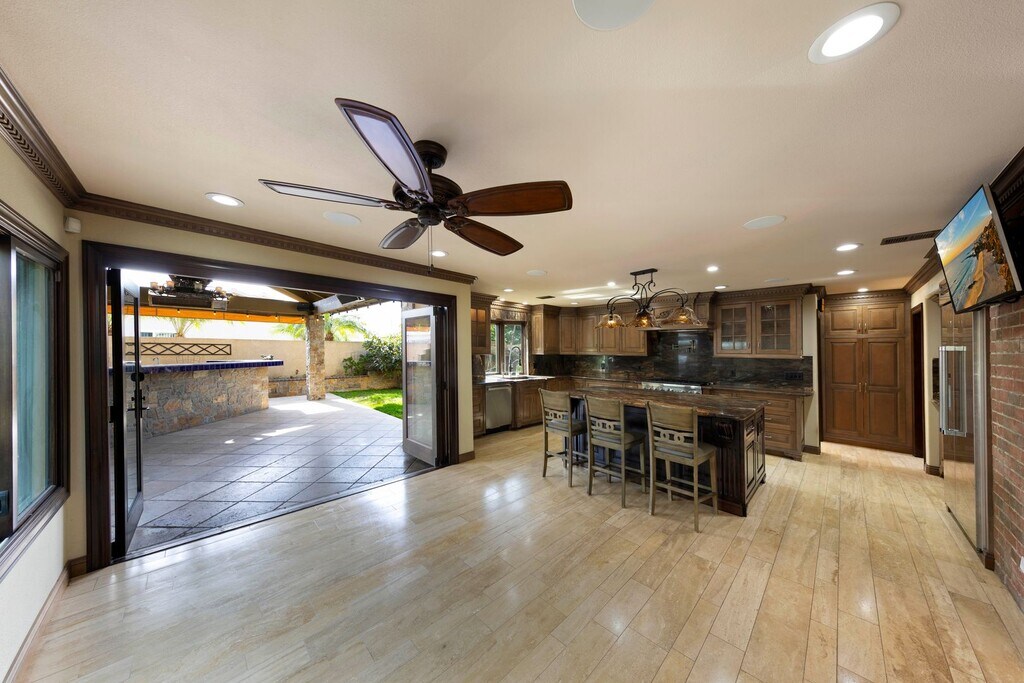 Beautifully maintained Tuscan-style custom home featuring 4 bedrooms and 3 bathrooms with spacious, light-filled living areas and soaring vaulted ceilings. The front living room offers a fireplace, skylight, and dramatic banister overlooking from the bonus room above, creating an open and inviting atmosphere. The custom kitchen showcases inset cabinetry, decorative corbels, a center island with additional storage and separate island lighting, drawer-style microwave, 6-burner gas cooktop, and built-in Thermador refrigerator. An additional electric oven is conveniently located in the garage. Comfortable bedrooms include custom-designed closets. Updated bathrooms and a generous bonus room provide flexible space for office, guests, or recreation. Private backyard retreat features a jacuzzi, water features, and a fully equipped outdoor bar with stove and barbecue—ideal for entertaining. Attached garage includes workbench, cabinetry, sink, and additional stove. Home also offers a newly installed LG Smart washer and dryer, 32 solar panels for energy efficiency, Generac backup generator, and central heating and air conditioning. Exceptional design, quality upgrades, and outstanding amenities throughout.