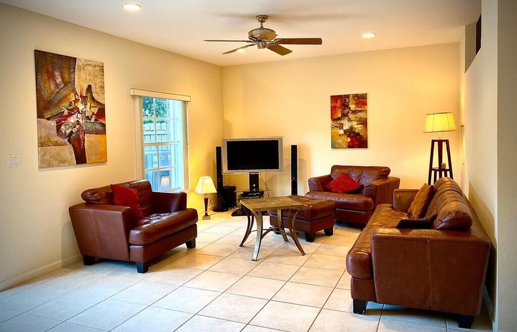 Courtesy of Regency Realty Services Posted by Andrew Coleman with EXP Realty . Prime Furnished Rental. Large Private Pool! Walking distance to Atlantic Ave/Downtown! East of US1 near Palm Trail! Walk/bike to Beach/Atlantic Ave. Well-kept home in prime East Delray location equipped with everything. Spacious fenced-in yard, deck, bbq, patio furniture. Large master with balcony & walk-in closet. Fully equipped kitchen with granite tops, 1st floor has laundry room, tile floors. 2nd has hardwood. 1-car garage plus 2-car driveway plus additional guest parking. Home has 5 beds & multiple leather sofas. Short or long term lease. Pool care included. Off-street guest parking. Includes multiple bicycles, lounge chairs, beach chairs, umbrellas! Quick approvals! Enjoy golf cart taxi with FreeBee Ride.