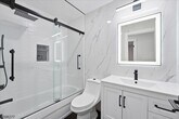 Be the first to lease this stunning, brand-new construction residence! It features a contemporary white & black interior design and beautiful light wood flooring throughout, offering modern amenities and an open-layout kitchen is a chef's dream, featuring a long breakfast bar, ample white cabinetry, marble countertops and backsplash, and brand new stainless steel appliances, including a refrigerator and a gas range. The residence ensures ultimate convenience with a full-sized, stacked washer and dryer unit installed within the space. The spacious living area is filled with natural light from a large window, while the bedrooms are designed to be bright and comfortable, complete with generous closet space. Come and check out your dream place to be!