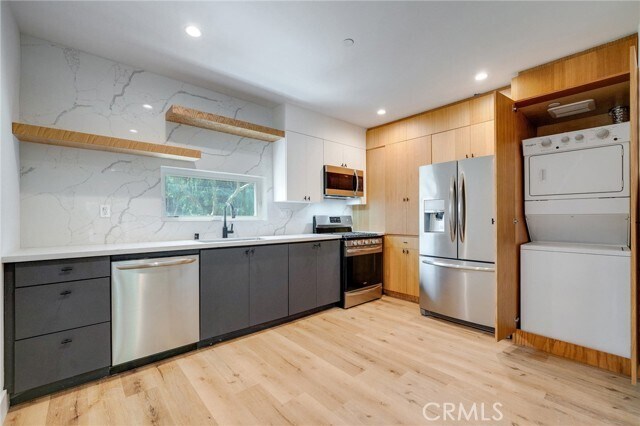 Introducing 6201 LA MIRADA, a 2022 construction secured entry 8-unit community of modern 2-level apartment residences in the heart of Hollywood. Live in true style in this stunning designed condo where functionality and luxury are uniquely embodied with 2-bedrooms, 2 baths and 1257 sf of high-end living. This space boasts brand new wide plank luxury flooring throughout, white quartz countertops, new stainless-steel appliances; including gas stove with range, French door refrigerator, microwave and dishwasher! Plus, closeted stacked Whirlpool washer/dryer. Other features include custom kitchen backsplashes, high ceilings, double-panel energy efficient windows, built-in shelves and custom cabinetry! This unit comes with one gated parking space. Security cameras are installed through the building for added safety. Each detail shows a dedication to quality, Modern in style and thoughtful in design, this is an extraordinary opportunity to embrace a chic lifestyle in a pristine new development. Enjoy living centrally in Hollywood! Minutes from Los Feliz, Silverlake and Melrose districts! Tons of nearby public transit, a few blocks from Hollywood/Vine or metro station. Convenient to Netflix headquarters, Sunset Bronson and Gower Studios. MLS# SR25266017
