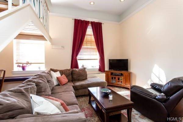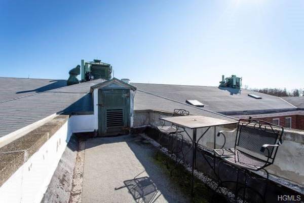 Available mid-October/Nov. 1st. Spacious top floor 2 Bedroom unit in elevator building with private terrace. This well cared for unit boasts 2 full bathrooms and is on the top floor of a peaceful location on wooded grounds. The setup: 1 bathroom, 1 bedroom, kitchen living and dining area on first floor and a lofted ensuite master bedroom on second floor with private terrace and storage room. Great features include open air terrace with large storage room, secured entrance with intercom, large living room with 22' ceilings, loft style master bedroom with skylight, modern kitchen appliances, ample kitchen storage, A/C, 2 parking spaces, and laundry within the building. Easy access to shopping, restaurants, and major highways. 10 minute drive to the Peekskill train station. Choose cable or FIOS. Rent includes water, heat, sewer, trash, landscaping and snow removal. Open to short term leases with a premium. Tenants must provide income of at least 36X the monthly rent. Please have good credit. Broker fee applies.
