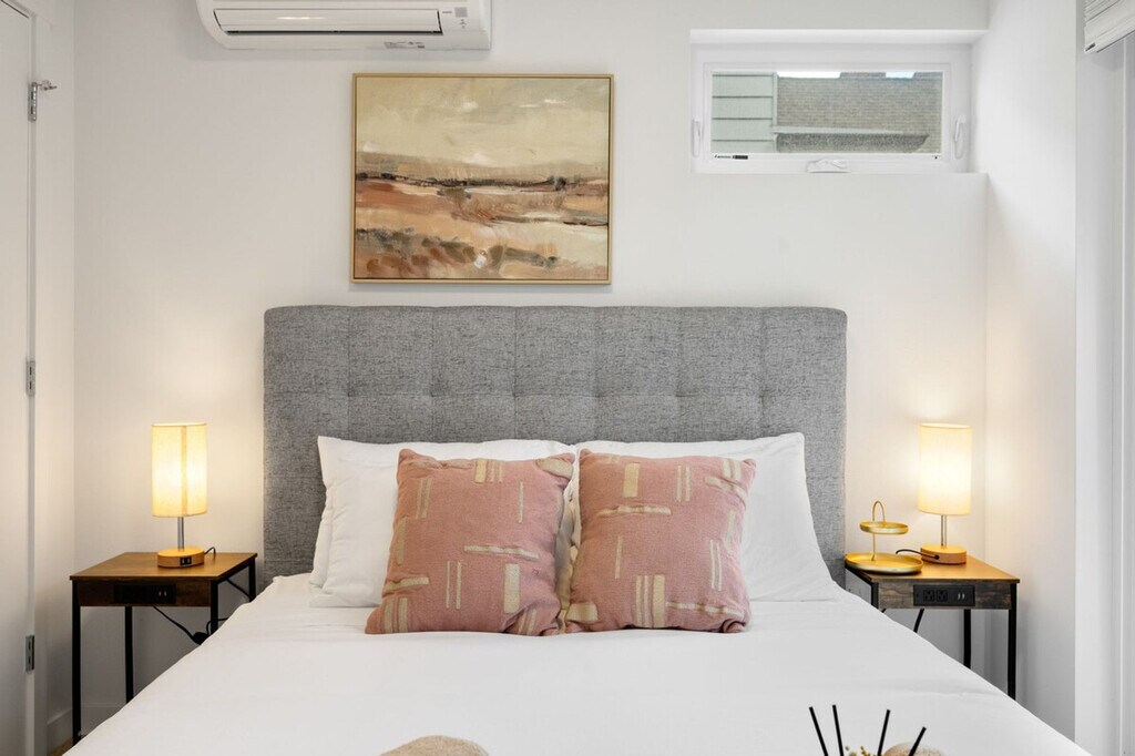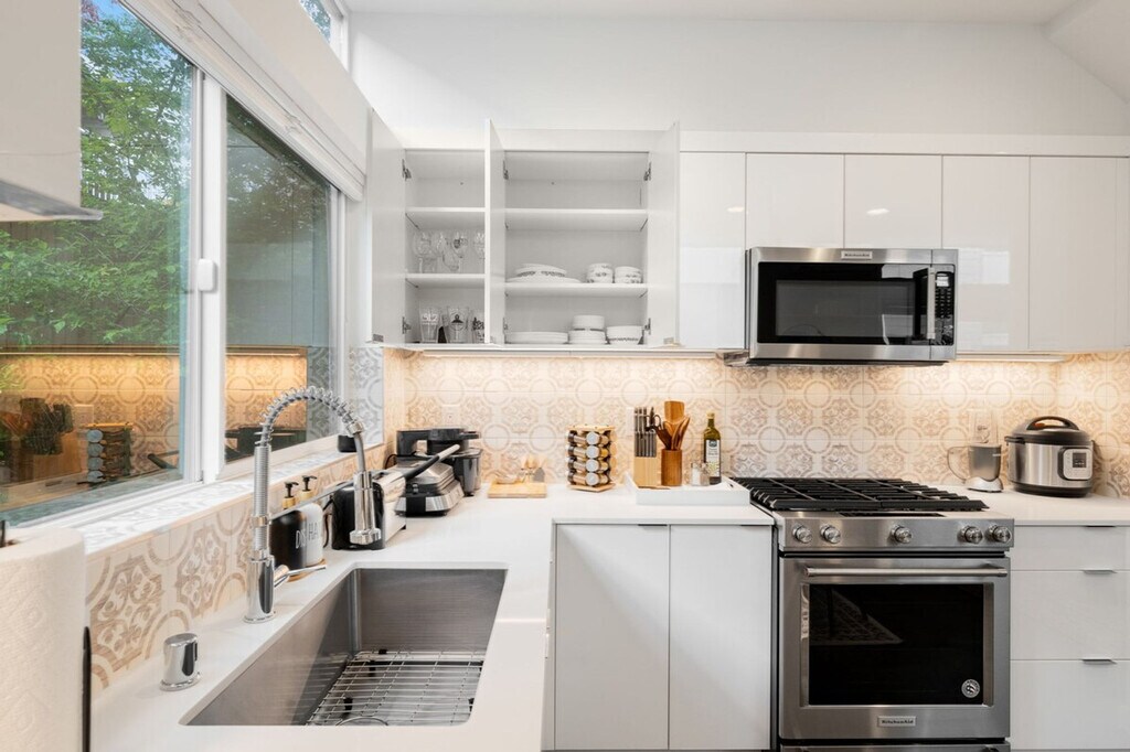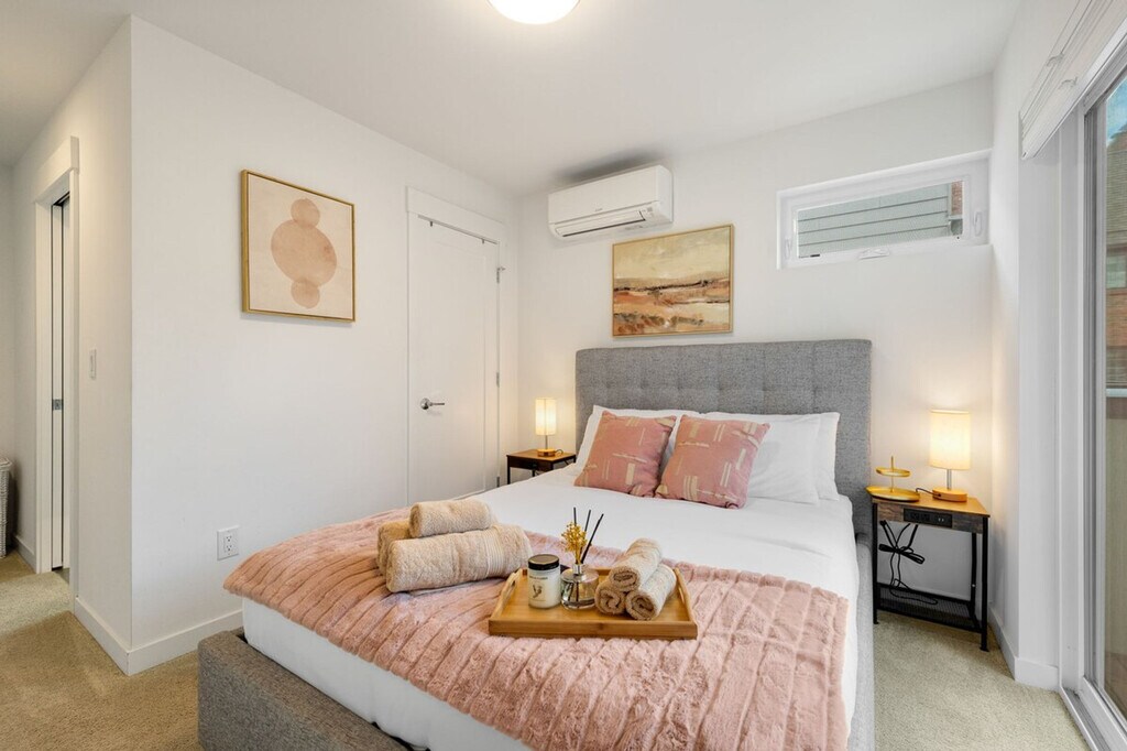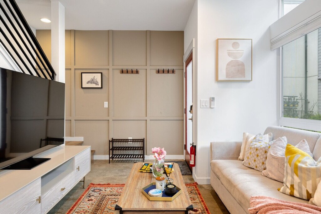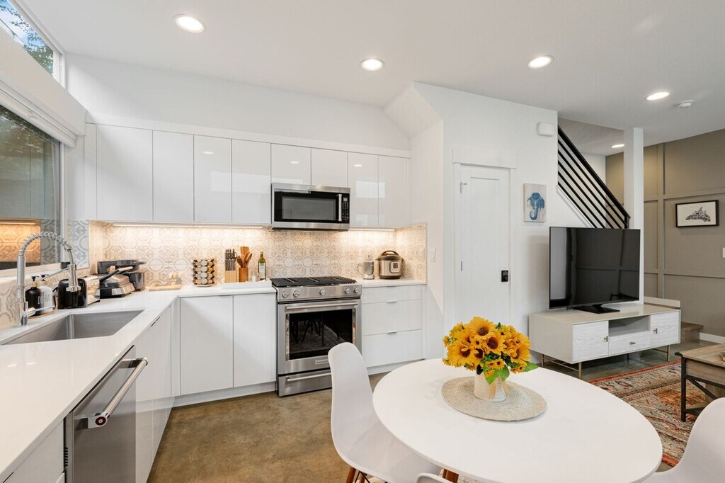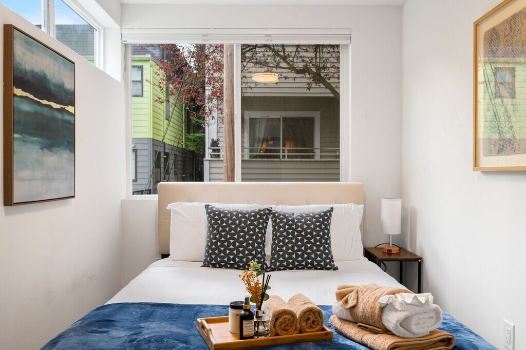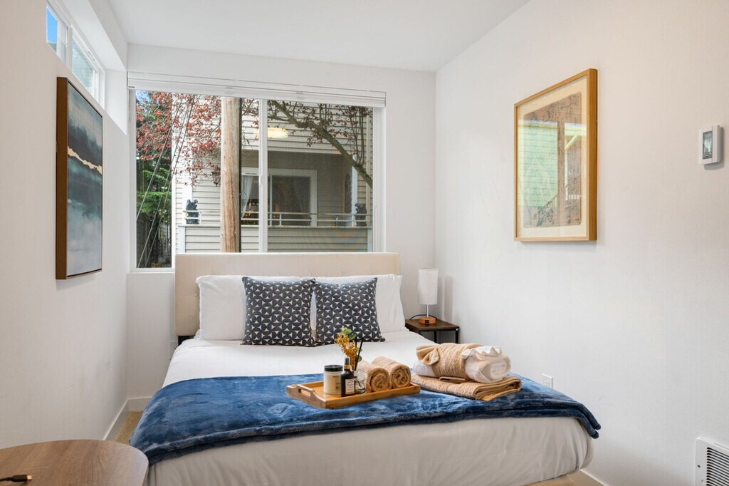 Experience the best of Seattle and feel at home in this chic Capitol Hill townhome. This 2-bedroom, 2-bathroom home offers 1045 sqft of living space. This is a 4-story townhome (including the rooftop) with no step at the entrance. This pet-friendly retreat features stylish furnishings, a fully equipped kitchen, and lightning-fast Wi-Fi. The kitchen is fully stocked with appliances, cookware, silverware, servingware, spices, Keurig coffee and tea. All beds are outfitted with high-quality mattresses, linens, and a comfortable duvet. A smart TV and high-speed internet are available for streaming or remote work needs. Onsite washer and dryer are available for your laundry needs. Enjoy the rooftop patio with comfortable outdoor furniture for an al fresco experience. The first floor features a living room with a queen sofa bed, kitchen, and dining area with air conditioning. The second floor includes a bedroom with a queen bed, a hallway bath with a bathtub and shower combo, and laundry facilities with heat only. The third floor features the primary bedroom with a queen bed, an en-suite bathroom with a shower, and a private balcony with air conditioning. Well-trained pets are welcome with a fee of $50 per pet per night. Paid public parking is available directly across the street from the townhome complex for a guaranteed spot. A city-issued guest parking permit is provided for free street parking. Centrally located, this home is just steps from top dining, shops, and more. Nestled on a peaceful street with an impressive 96 walk score, it's just a block from buzzing Broadway’s restaurants, shops, and nightlife, and a short stroll to Volunteer Park and the Link Light Rail. With a transit score of 79 (9-minute walk to Caphill Link Light Rail) and a bike score of 88, this location is ideal for exploring Capitol Hill, the epitome of 21st-century Seattle: young, high-tech, and culturally adventurous. It's the epicenter of coffee culture, home to clubs that spawned the grunge movement, and the site of some of Seattle's biggest events, like Block Party and the Pride Parade. Enjoy visiting beautiful Volunteer Park, the Seattle Asian Art Museum, or dining and hanging out at a microbrewery. Guests must be comfortable with stairs as there are multiple stories in this townhome. The second-floor bedroom does not have AC. The home does not have dedicated parking, and street parking is first-come-first-served and can be hard to find depending on the time of day. Strictly no parties and events are allowed, quiet hours are between 10 pm and 8 am, no smoking or vaping of any kind is allowed anywhere on the property including outdoor areas, no digital piracy is allowed, and no shoes are allowed in the home. A $500 fine will be charged per violation. Kindly refrain from allowing pets on furniture/linens including couches, throws, beds, pillows, and towels. Please do not leave pets unattended and bring poop bags to pick up after your pets. Registration Number: STR-OPLI-25-000217 [SI]