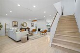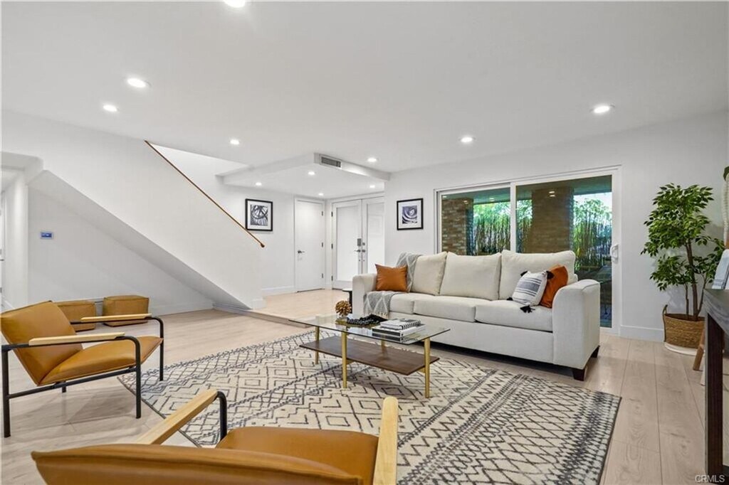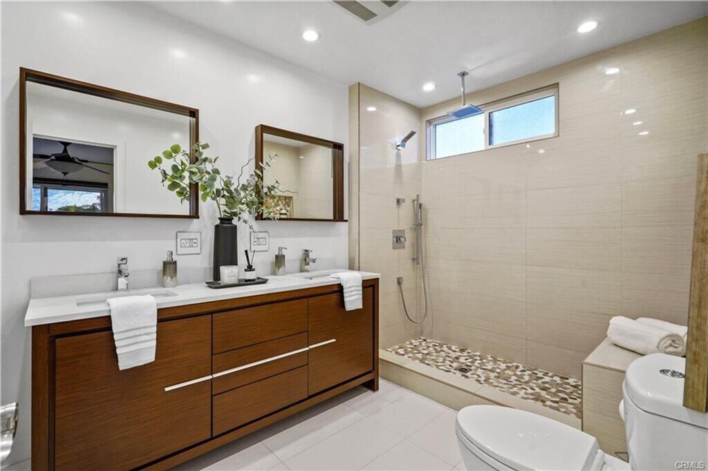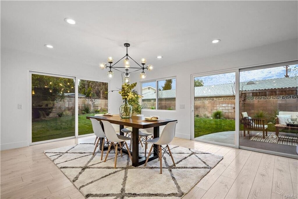 Tucked away on a quiet cul-de-sac, this beautifully remodeled Encino residence is now available for lease, offering a thoughtful layout, abundant natural light, and stylish upgrades that create a true Southern California retreat. Modern double-entry frosted glass doors welcome you into a bright and airy 3-bedroom + office home featuring newer windows and sliding glass doors that enhance the seamless indoor-outdoor flow. The chef’s kitchen is well-appointed with a Bertazzoni stove, range hood, and dishwasher, shaker cabinetry with soft-close doors and drawers, quartz countertops, a microwave drawer, and a beverage and wine fridge. The open-concept living and dining areas are highlighted by a dramatic double-sided glass rock fireplace, providing a striking focal point and warm ambiance throughout. A cozy front patio surrounded by lush greenery offers a peaceful, private space to relax. Upstairs includes three spacious bedrooms and two updated bathrooms. The expansive primary suite features a spa-inspired bathroom with dual sinks, high-end shower fixtures, and a generous walk-in closet with custom built-ins. Downstairs offers versatile flex space ideal for a home office, gym, bonus room, or optional fourth bedroom, complete with sliding glass doors that open to a private backyard. The outdoor space features a large grassy area perfect for entertaining or everyday enjoyment, along with a private outdoor sauna—creating a rare at-home wellness experience. Conveniently located just minutes from the 101 Freeway, Ventura Boulevard, Encino Commons, Balboa Park, and Trader Joe’s, this exceptional lease opportunity combines comfort, style, and prime location.