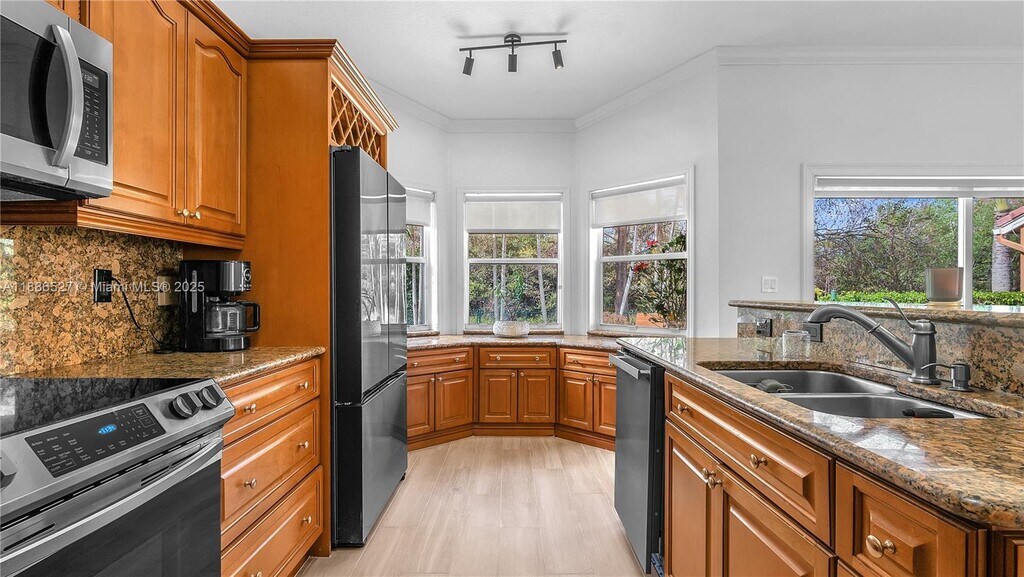 Discover this stunning 4-bedroom, 2-bathroom pool home in the exclusive gated community of Alhambra, featuring serene west-facing views of a private preserve. Freshly painted and boasting a series of recent upgrades, this home is move-in ready. Enjoy the durability and style of a concrete tile roof installed in 2018, elegant porcelain wood-like flooring, and new kitchen appliances. Additional upgrades include a new AC system, and hurricane impact garage door. This home is has hurricane impact accordion shutters, a brick paver driveway, and a split floor plan with an open concept that's perfect for entertaining. Additional features include a two-car garage, energy-efficient LED fixtures. Located in a community with top-rated schools and offering easy access to I-75 and US-27.