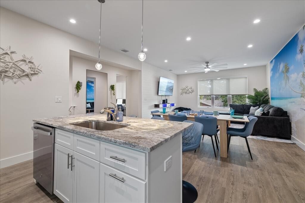 Minutes from the Gulf beaches,this 3 bedroom,3 bathroom townhome offers modern finishes,flexible rental options,and an incredible rooftop living experience. Available for short term or long term rental,including weekly and monthly options. The main living level features an open layout with luxury vinyl flooring throughout. The living and dining areas are spacious and filled with natural light. The kitchen is designed with white shaker cabinetry,stone countertops,stainless steel appliances,a gas stove,and a large island with bar seating. The primary suite includes a private en-suite bathroom and generous closet space,while the additional bedrooms are thoughtfully positioned for privacy and functionality. An elevator provides convenient access to all levels of the home. The rooftop terrace is the true standout,designed for both entertaining and relaxing. This expansive private space features a built-in outdoor kitchen with grill,sink,and beverage fridge,a covered bar area with mounted TV,and multiple seating areas throughout. There is plenty of room for dining,lounging,and hosting,all set against open views and beautiful sunsets. Whether you are entertaining guests or unwinding at the end of the day,this rooftop delivers a full outdoor living experience. Additional features include a 2-car garage,in-unit laundry,and a multi-level layout that offers both space and separation. Conveniently located near some of Pinellas County’s most popular beaches,restaurants,and entertainment. MLS# TB8498588