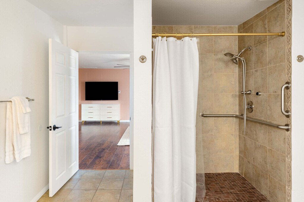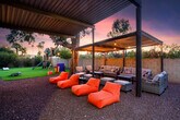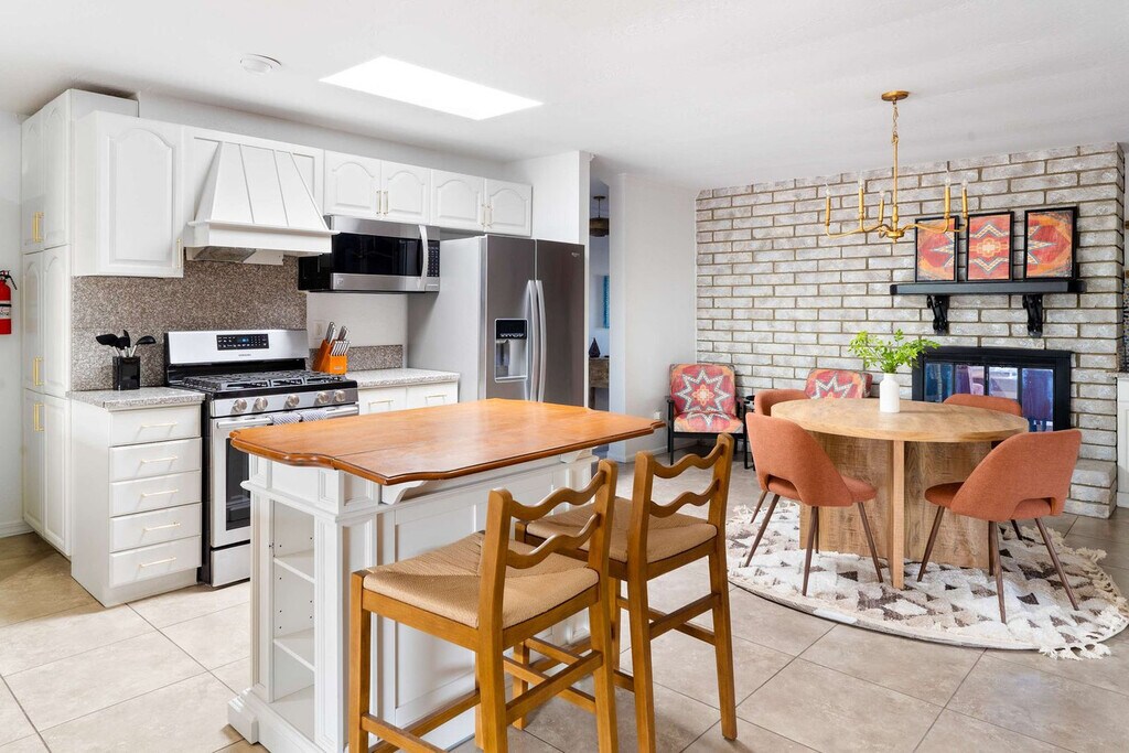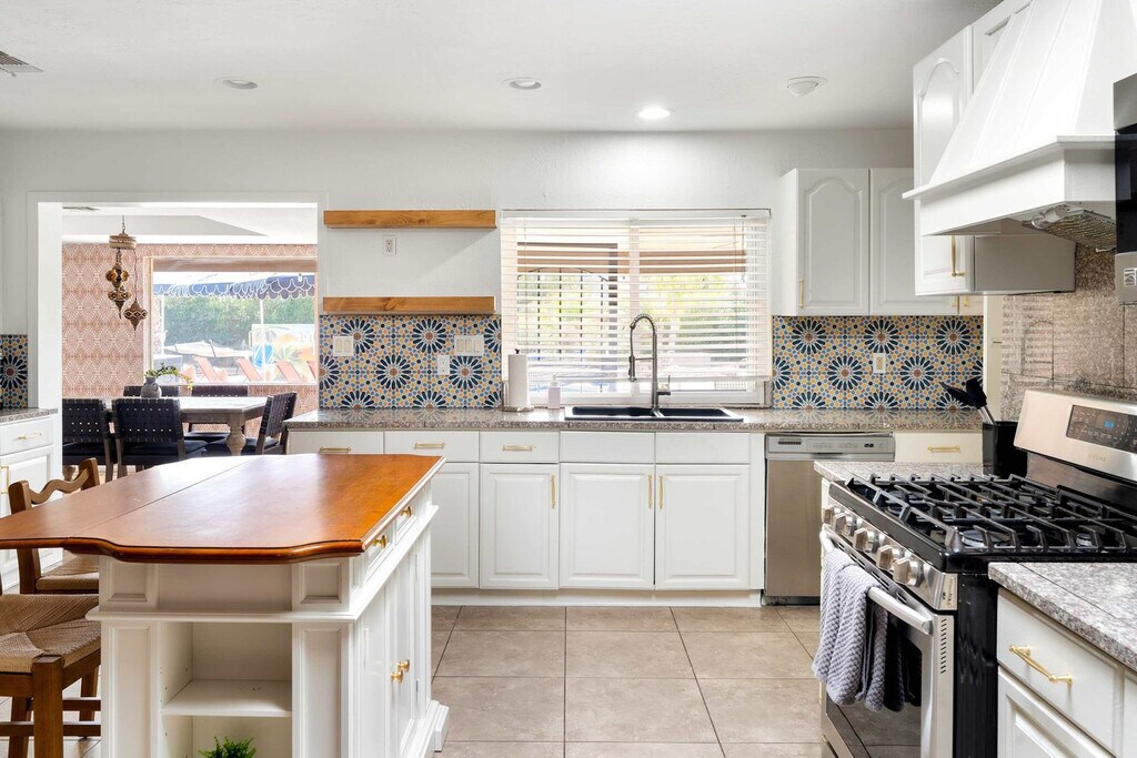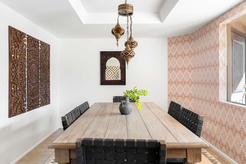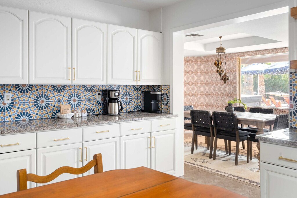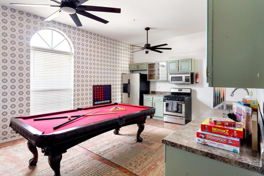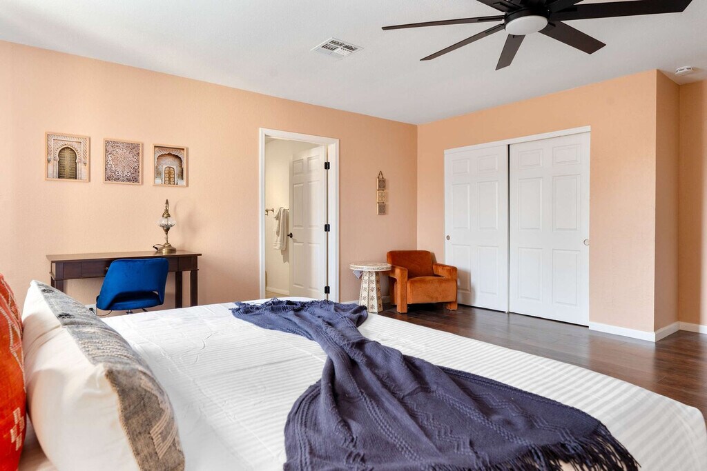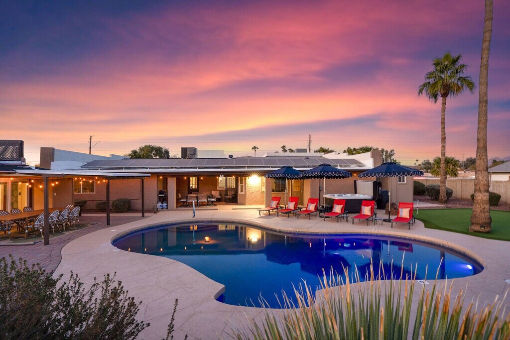 This 8-bedroom home in Scottsdale, AZ is a haven for vacationers seeking both relaxation and adventure. With a private heated pool, hot tub, and a sports court for basketball and pickleball, this property offers endless entertainment options. The home also features a kid's playground, a movie theater, and an in-home gym, ensuring that every guest feels at home. The spacious layout includes a private casita, accommodating up to 24 guests comfortably. Welcome to Moroccan Oasis, your ultimate escape! This breathtaking 8-bedroom, 6-bathroom retreat with a private casita is perfect for up to 24 guests, blending fun, comfort, and relaxation. Dive into a backyard oasis packed with games, a movie theater, and endless entertainment! Whether you're lounging by the private pool, challenging friends on the sports court, or enjoying the outdoor dining area, Moroccan Oasis has it all. The fully stocked kitchen with high-end appliances and a large island with high seating is perfect for preparing meals and gathering with loved ones. Up to 2 dogs are allowed for $125 per stay, and we kindly ask that your dog is crate trained and that you pick up after your dog. Parking is available in the driveway for up to 6 cars. Located just minutes from top attractions, dining, and shopping, this home offers easy access to Scottsdale's vibrant lifestyle. Explore nearby destinations like Scottsdale Quarter, Kierland Commons, and TPC Scottsdale, or enjoy cultural experiences at the Musical Instrument Museum. With a variety of restaurants and entertainment options nearby, you'll have everything you need for an unforgettable stay. Check-in is at 4pm and check-out is at 10am. No parties are allowed, and violations may result in immediate termination of the stay. An exterior camera is installed solely to monitor our cleaning team for quality and security purposes. The house is outfitted with a Minut device which monitors noise decibels but does not record, ensuring a respectful environment for neighbors. Guests must be 25 years or older to book this property. The home features a dedicated workspace in several bedrooms, equipped with smart TVs and ceiling fans, providing a comfortable environment for remote work. A laptop computer is not included. Registration Number: TPT 21582036, STR-2024-004542, RR-00443685 [SI]