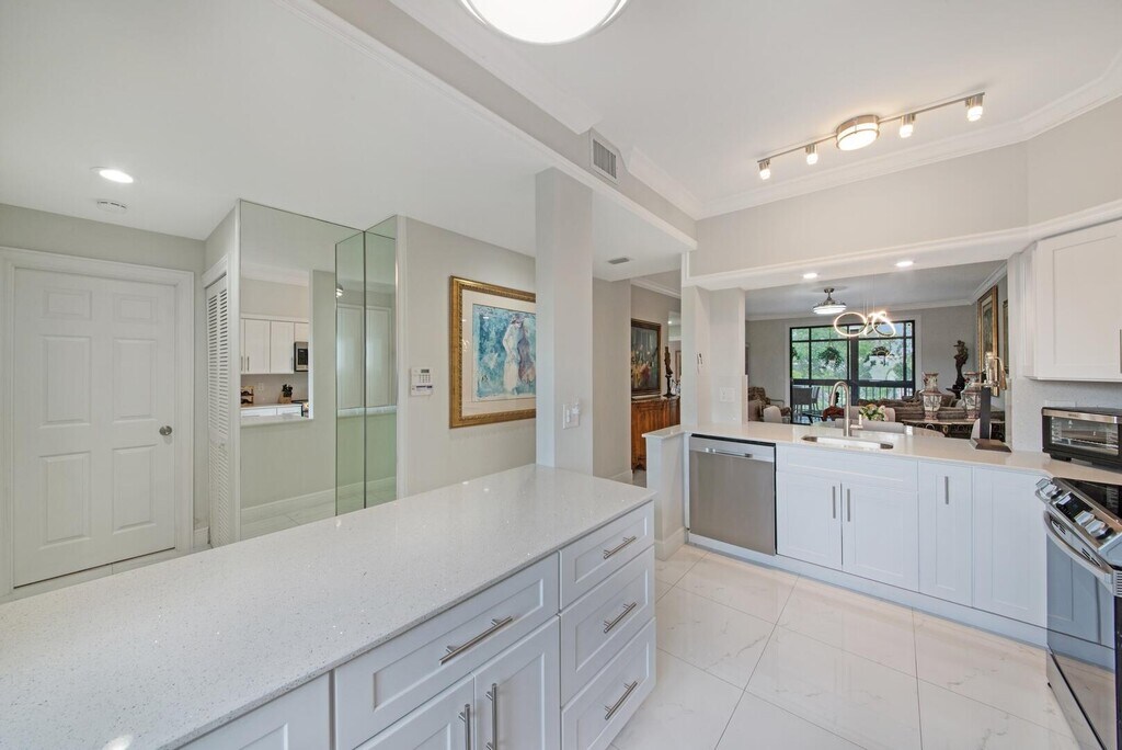Enjoy effortless living in this fully equipped, fully furnished, turnkey 2-bedroom, 2-bath condo in the desirable Huntington Pointe community. This beautifully updated unit features a bright, open layout with large porcelain tile flooring and neutral tones throughout. The modern kitchen boasts classic white cabinetry, Quartz countertops, and newer stainless-steel appliances. The spacious primary suite includes dual custom closets and sliding doors leading to a screened-in balcony, where you can take in breathtaking lake views. Both bedrooms offer en-suite baths for ultimate convenience. With abundant natural light and stylish finishes, this move-in-ready condo is perfect for comfortable living.