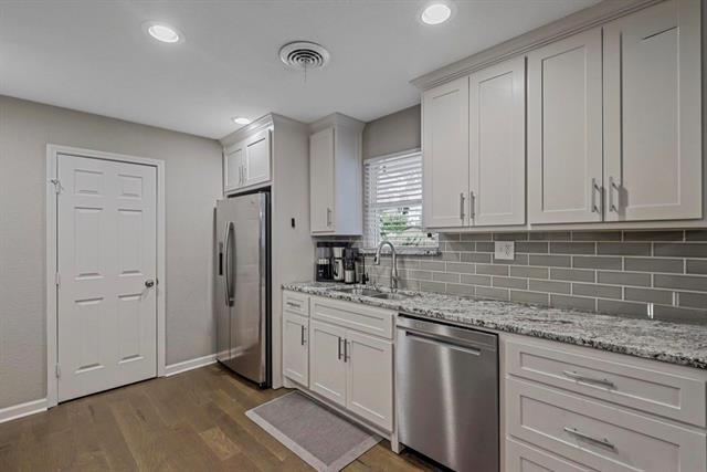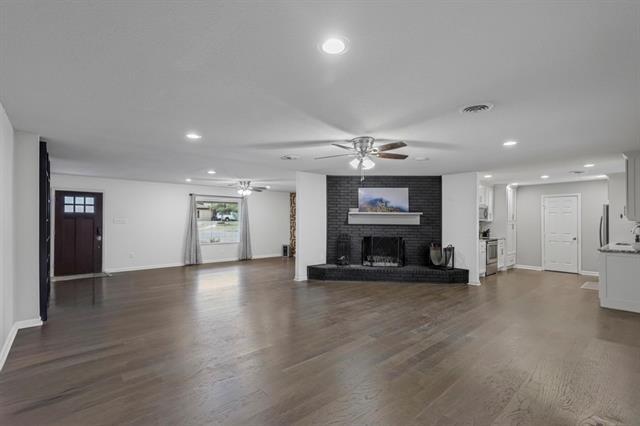 Spacious 4-bedroom mid-century modern ranch in the heart of Wedgewood with an oversized backyard and excellent indoor-outdoor living. Recently painted and thoughtfully updated, this home offers generous entertaining and everyday living space with a seamless layout where the kitchen opens to both the family room and dining area for easy flow. The kitchen features shaker-style cabinets, stainless steel appliances, and a classic subway tile backsplash. The painted fireplace serves as a central gathering point in the main living area. Both bathrooms have been updated, and the laundry room provides ample storage and functionality. Step outside to a covered patio overlooking a large fenced yard with mature shade trees. An additional gravel area creates the perfect spot for a firepit or outdoor seating area. Conveniently located just minutes from I-20, TCU, shopping, and dining. Available for move-in March 1. Two-year lease preferred.
