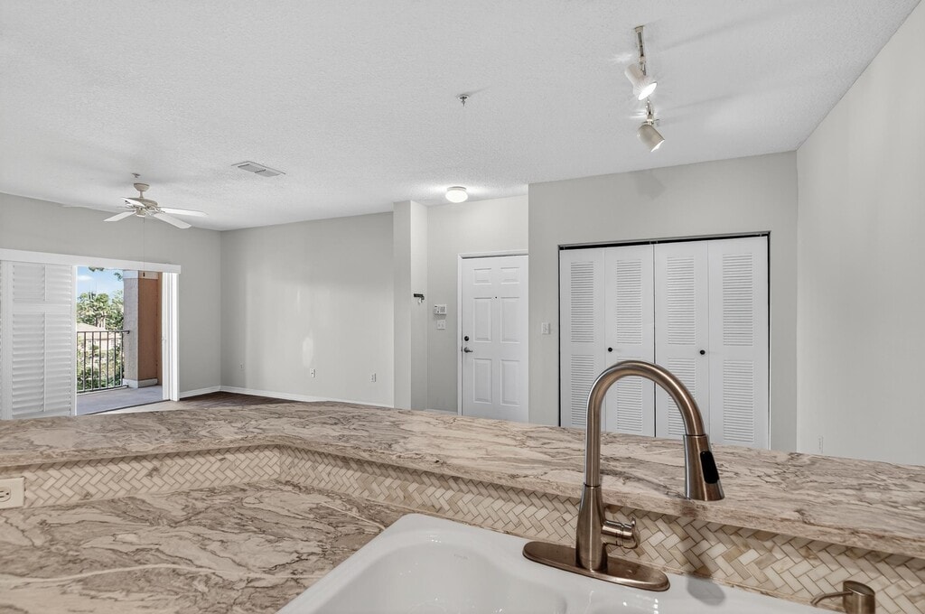 JUST REDUCED!! Beautiful 2/1 condo offers pond views, brand new kitchen with granite counter tops and stylish custom plantation shutters on all the windows. This condo is move-in ready and pet friendly. Enjoy laminate wood floors, and a spacious great room with separate dining and living areas, along with a large storage closet. The kitchen has been updated with stylish granite counters, tile backsplash. Includes washer, dryer, microwave, range, refrigerator, and dishwasher. The primary bedroom features his and hers closets, providing plenty of storage space. A brand-new A/C has been installed, and this home is truly move-in ready. Step out onto the spacious lanai and enjoy the private views, creating a perfect place to relax and unwind.
