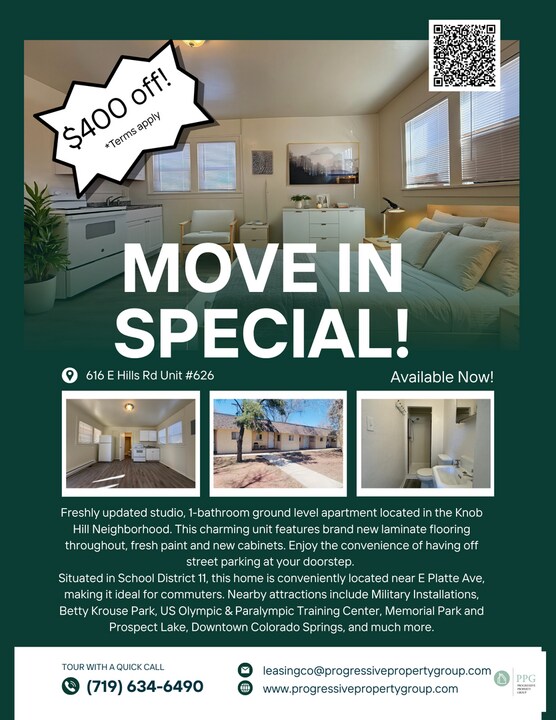Freshly updated studio, 1-bathroom ground level apartment located in the Knob Hill Neighborhood. This charming unit features brand new laminate flooring throughout, fresh paint and new cabinets. Enjoy the convenience of having a ground level entry with off street parking at your doorstep. Unreserved and ample parking is available in the lot in front of the building. Situated in School District 11, this home is conveniently located near E Platte Ave, making it ideal for commuters. Nearby attractions include Military Installations, Betty Krouse Park, US Olympic & Paralympic Training Center, Memorial Park and Prospect Lake, Downtown Colorado Springs, and much more. Features: - NEW Carpet & LVP flooring - Legacy trees provide plenty of shade - Parking lot - School District 11 - Built 1936 Utilities: - A Flat Rate of $75/month for Utilities (Water, Sewer, Gas & Trash) will be charged by the Management Company, along with a $5.00 per month Administrative Processing Fee. - Residents are responsible for setting up individual Electric service in their name and paying directly to Colorado Springs Utilities for the duration of the lease term. Account number must be provided to PPG at lease signing. Move-in Special: - Military personnel receive half off the application fee with a valid military ID. - First Months Rent Half Off! Pet Policy: - Dogs/Cats are welcome. - Limit of 1 mature cat and 1 mature dog under 45lbs. - A pet deposit of $200 and pet rent of $35/Mo per pet will apply. Smoking Policy: - No smoking or marijuana permitted. *Disclaimer: Photos may include virtual staging and/or images of a similar unit. Actual unit features, layout, and furnishings may vary. We’re excited to offer AppFolio Guard, providing a secure and simple way to manage your security deposit. This service allows for payment installments, ensuring a smooth and transparent process with timely updates and clear documentation throughout your tenancy! Don’t wait—homes in this area go fast! A prospective tenant has the right to provide to the landlord a portable tenant screening report, as defined in section 38-12-902(2.5), Colorado Revised Statutes; and If a prospective tenant provides the landlord with a portable tenant screening report, the landlord is prohibited from: Charging the prospective tenant a rental application fee; or Charging the prospective tenant a fee for the landlord to access or use the portable tenant screening report. Contact Us: Progressive Property Group LLC *This property is part of PPG’s Featured Referral Program. **Move in special is $400 off the first full month of rent and will be applied with fully executed lease and all fees paid. Inquire within for additional details. End Unit Fridge Ground Level Entry Legacy Trees New Cabinets New Lvp Flooring Throughout New Stove Tenant Pays Electricity