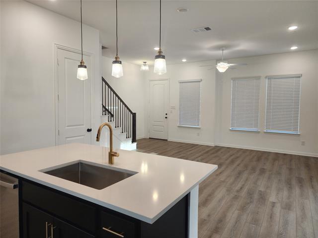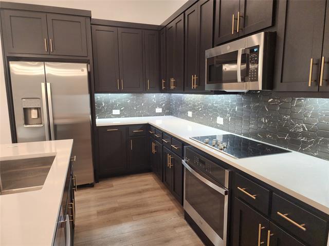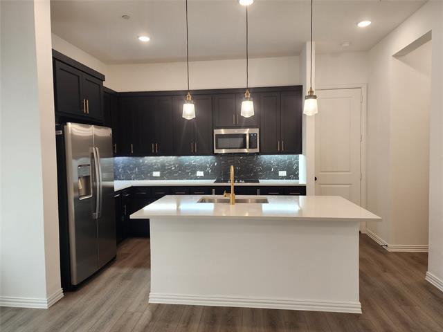 Ready Now! ~ End Unit! Experience low-maintenance living with high-end style in this beautifully designed new townhome. Ideally located in the vibrant heart of Mansfield, Texas. Designed with the Noir Collection, this home features high contrasts and gold finishes. This thoughtfully crafted two-story townhome welcomes you with an open-concept floor plan that combines modern design with everyday functionality. The stylish kitchen is a true centerpiece, featuring stainless steel appliances, an eat-in island, and a spacious walk-in pantry—perfect for meal prep, storage, and casual dining. Upstairs, privacy and comfort take center stage. A large landing area leads to the serene primary suite, which includes a private bathroom with a dual-sink vanity, a glass-enclosed walk-in shower, and an oversized walk-in closet. Two additional secondary bedrooms share a well-appointed full bath and convenient linen storage. Whether you're relaxing at home or exploring all that Mansfield has to offer, this townhome offers the perfect blend of comfort, style, and location.