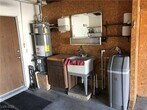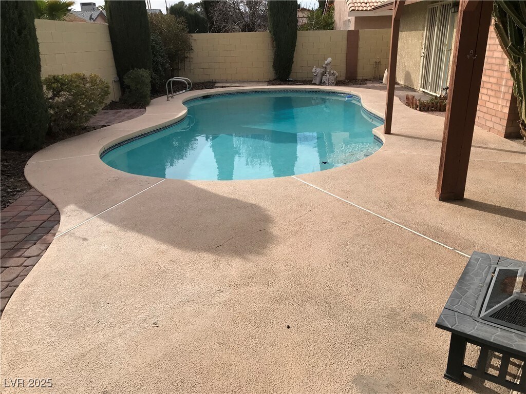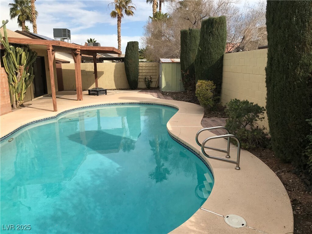2 car garage with a work bench and sink area that houses the water softener system and the gas water heater. A covered porch with a security gate. A covered patio with a pool to the back yard along with a storage shed. A fireplace in the living room. Window covering and a washer and dryer. The landscaping and pool service is included.