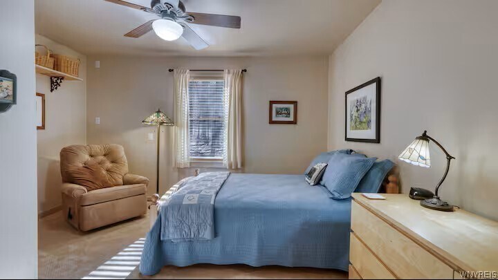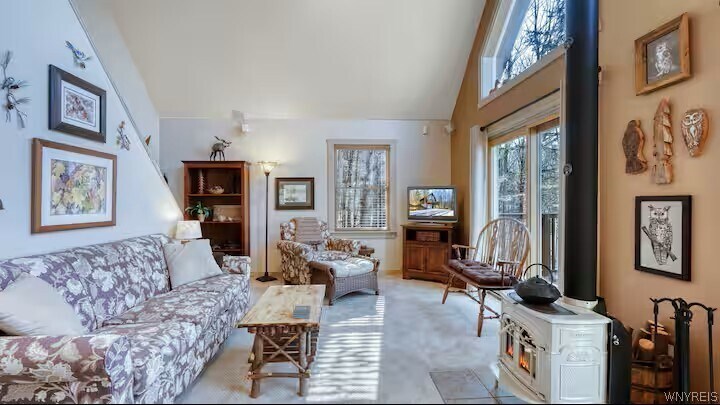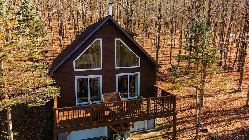 Escape to your own private retreat just outside of Ellicottville! Nestled in a peaceful,wooded,& secludedsetting,this fully furnished cedar A-frame chalet is available for rent & offers the perfect blend ofcomfort & nature.The home features a bright & airy open-concept living space on the 2nd flr,complete with acozy wood stove,a stunning wall of windows,& 2 sliding glass doors leading to a spacious deck—ideal forrelaxing or entertaining. The updated kitchen includes a breakfast bar,and all the appliances you need toprepare meals w/ ease. Also on the main level,you’ll find a large bedroom,a full bath,& a convenientmudroom with access to the wooded backyard. The 3rd level offers a charming loft space along with anadditional full bath—perfect for guests or extra living space.The walkout lower level includes a generousmudroom,an additional bedroom,& access to the extra-long heated garage,which also houses the laundry area.Enjoy year-round outdoor activities including hiking,biking,snowshoeing,and cross-country skiing.