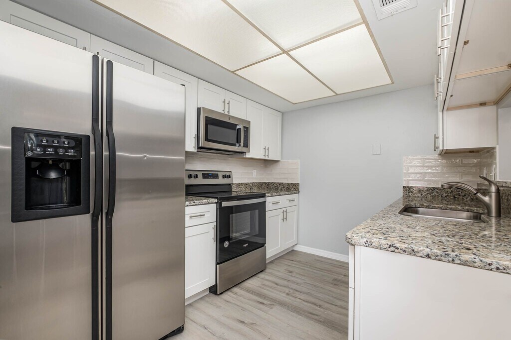 Completely remodeled 2 bedroom, 1 bath patio unit for rent in the heart of Melbourne, FL. Granite counter tops, stainless steel appliances, remodeled bathroom, bonus vanity/sink area & new modern plank flooring througout. Pool, clubhouse & quiet community. Close to L3 Harris, Melbourne Regional Hospital, the upcoming Amazon Distribution Center and much more. Brand new washer & dryer, upgraded HVAC system controls, USB outlets and more. Private, quiet unit with a patio/courtyard and a bonus screened in patio with storage.