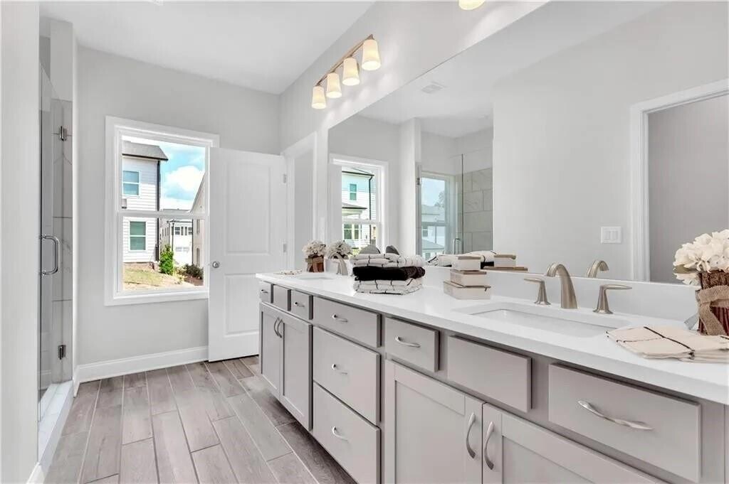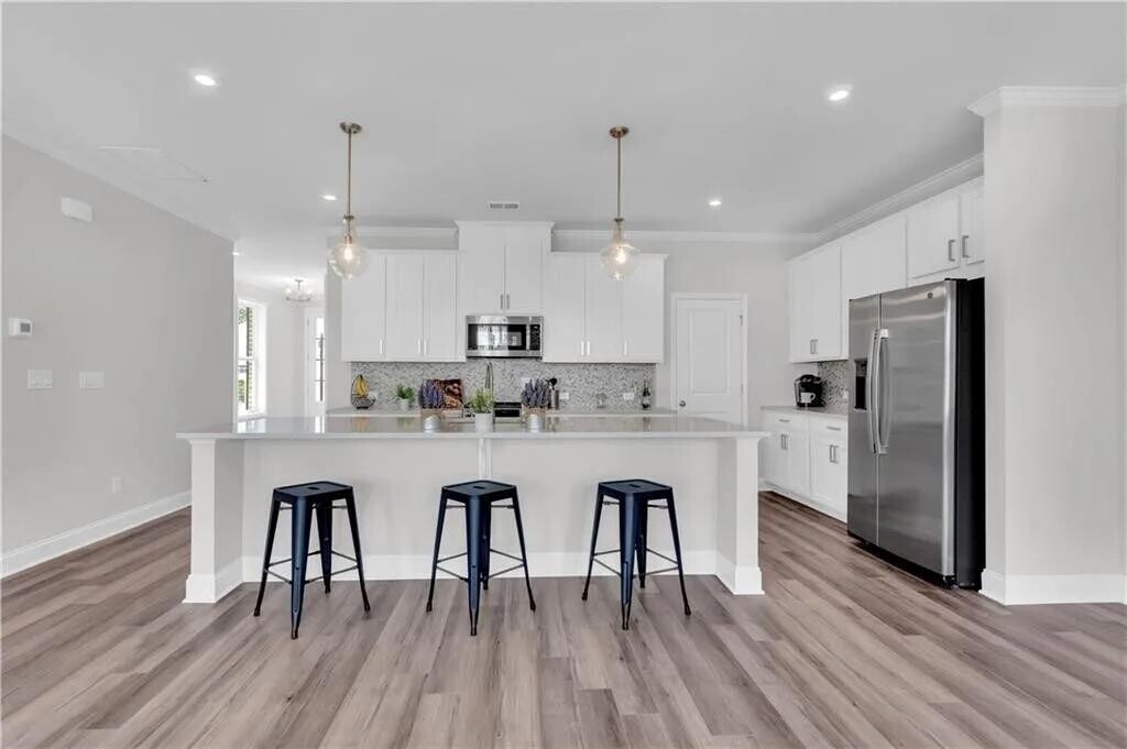 Welcome to this stunning END UNIT townhome located in the desirable,gated swim community of Magnolia Walk. This beautifully designed home features 2 stories,2-car garage,3BD,2.5BA and rear covered patio boasts modern finishes and a thoughtfully designed layout,making it perfect for both relaxation and entertaining. Key Features & Highlights LVP Flooring: Gorgeous Luxury Vinyl Plank flooring flows seamlessly throughout the main level,offering both durability and style. The chef's kitchen features quartz countertops,stainless steel appliances,and crisp white cabinets,opening to the spacious family room-a perfect space for gathering with loved ones. Open Concept Living: The family room is flooded with natural light from a wall of windows,with a cozy gas fireplace as the focal point. The adjacent breakfast room overlooks the beautiful backyard with a private covered patio,perfect for outdoor relaxation. Main-Level Powder Room: A charming powder room on the main level adds convenience for guests. Two-Car Garage: Ample parking with a 2-car garage with high end epoxy flooring and overhead storage. Upstairs Retreat Spacious Master Suite: The master suite features trey ceilings and an ensuite bath with a separate walk-in shower and double vanities,and an enlarged walk-in closet-providing a true retreat. Two Additional Bedrooms: Two generously sized bedrooms share a full bath with bath tub and double vanities,offering comfort and privacy for family or guests. Exterior & Location Private,Landscaped Backyard: Enjoy the outdoors with a beautifully landscaped and relaxing rear patio. Convenient Location: Ideally located near downtown Alpharetta,GA 400,and top shopping,dining,and parks-Halcyon,Avalon,and Fowler Park are just minutes away.