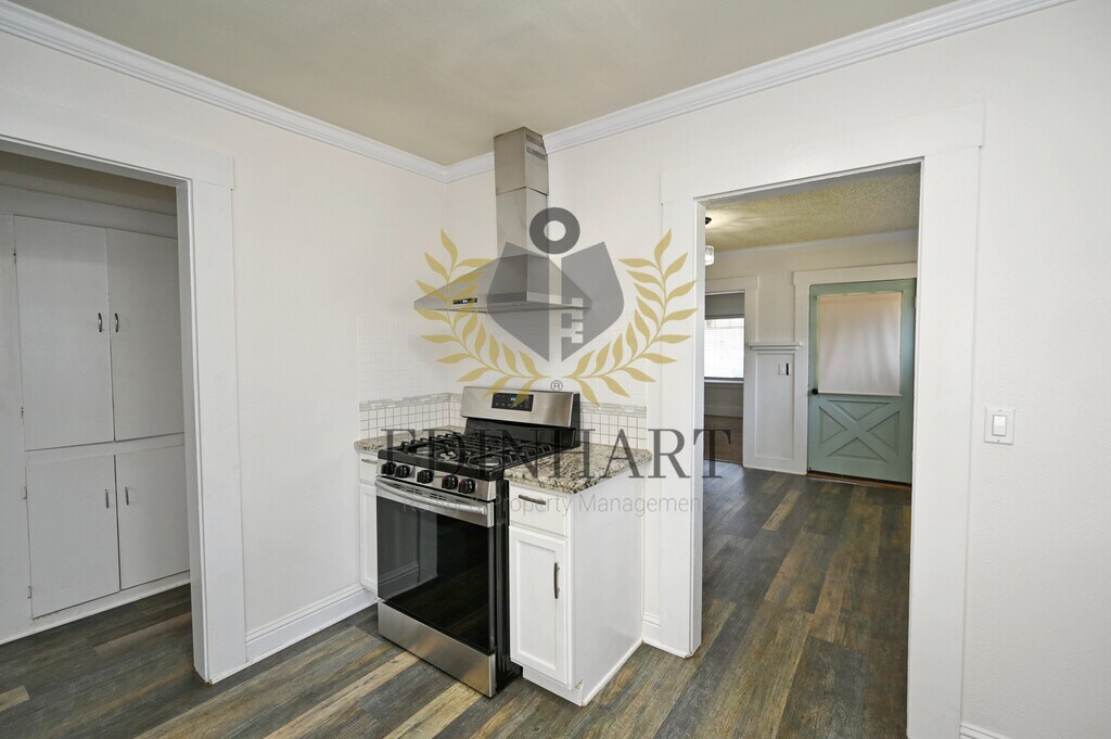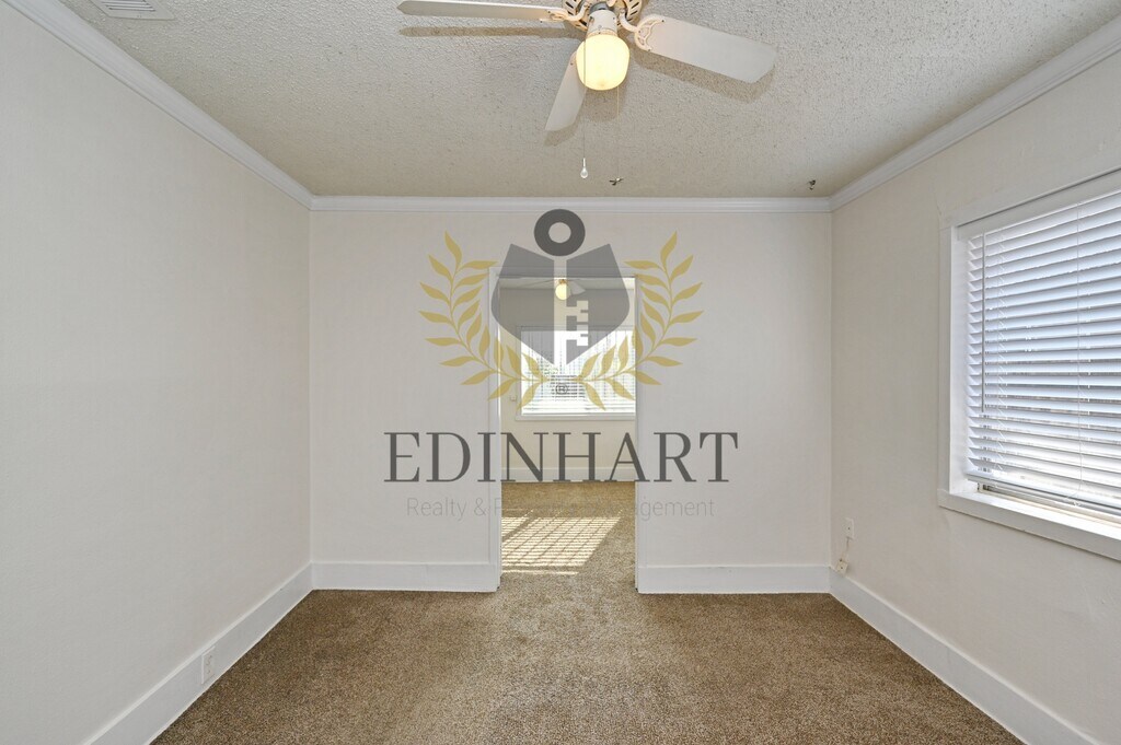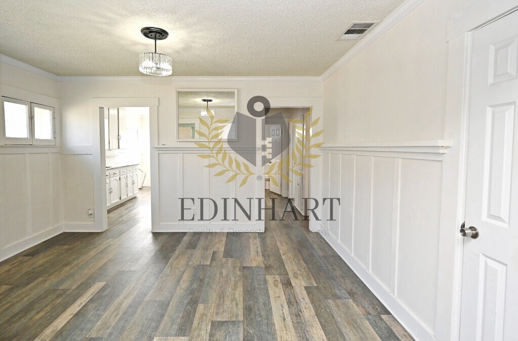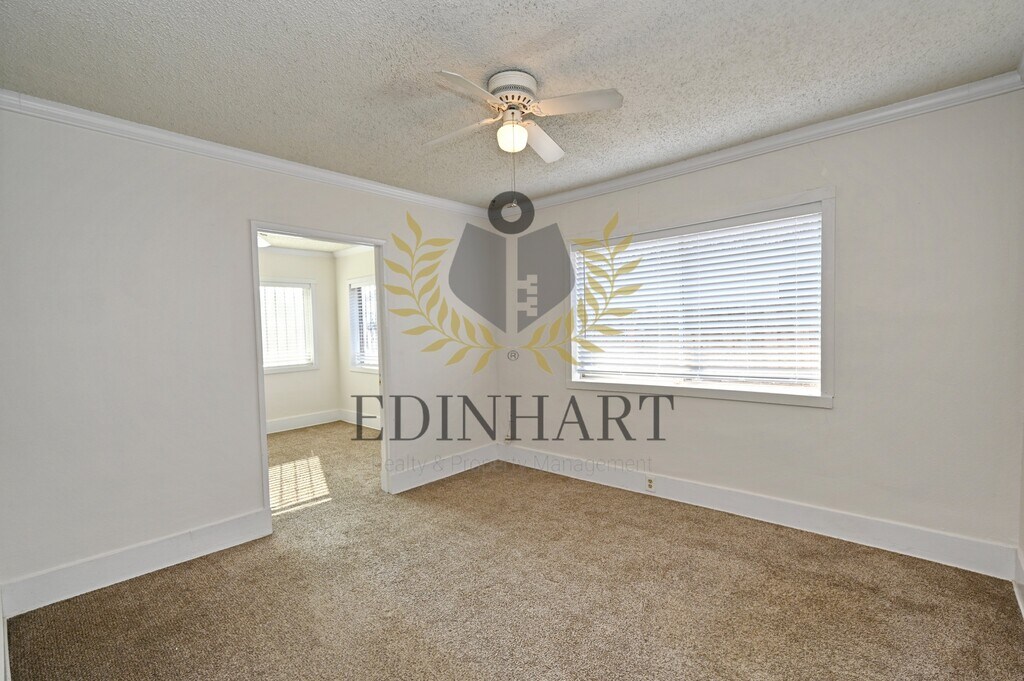 This three-bedroom, one-bath home offers a comfortable and well-maintained living space with a nice balance of charm and everyday functionality. Updated flooring runs through the main living areas, while the bedrooms feature carpet, creating a cozy and practical layout that feels easy to settle into. The kitchen is simple and refreshed, featuring white cabinetry, granite countertops, and a stainless-steel gas range that works well for daily use. Natural light fills the home, and subtle updates like crown molding and modern fixtures add to the overall feel without overpowering the space. Each bedroom includes a closet, ceiling fan, and window coverings, and the bathroom has been updated with a tiled shower and a granite-topped vanity. The neutral color palette throughout makes the home easy to personalize. The backyard provides usable outdoor space, with landscaping included for convenience. A refrigerator is included. Tenants are responsible for all utilities. No pets are allowed. A security deposit and renters insurance are required.