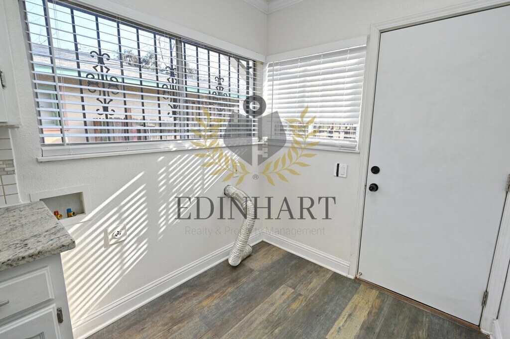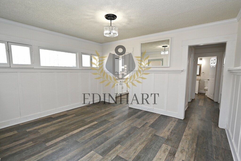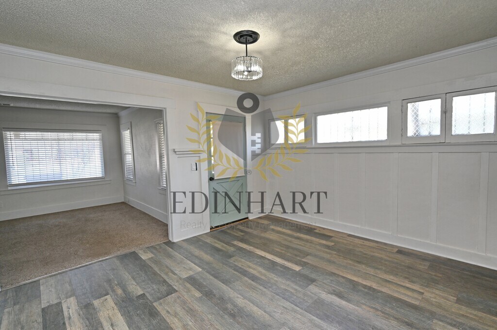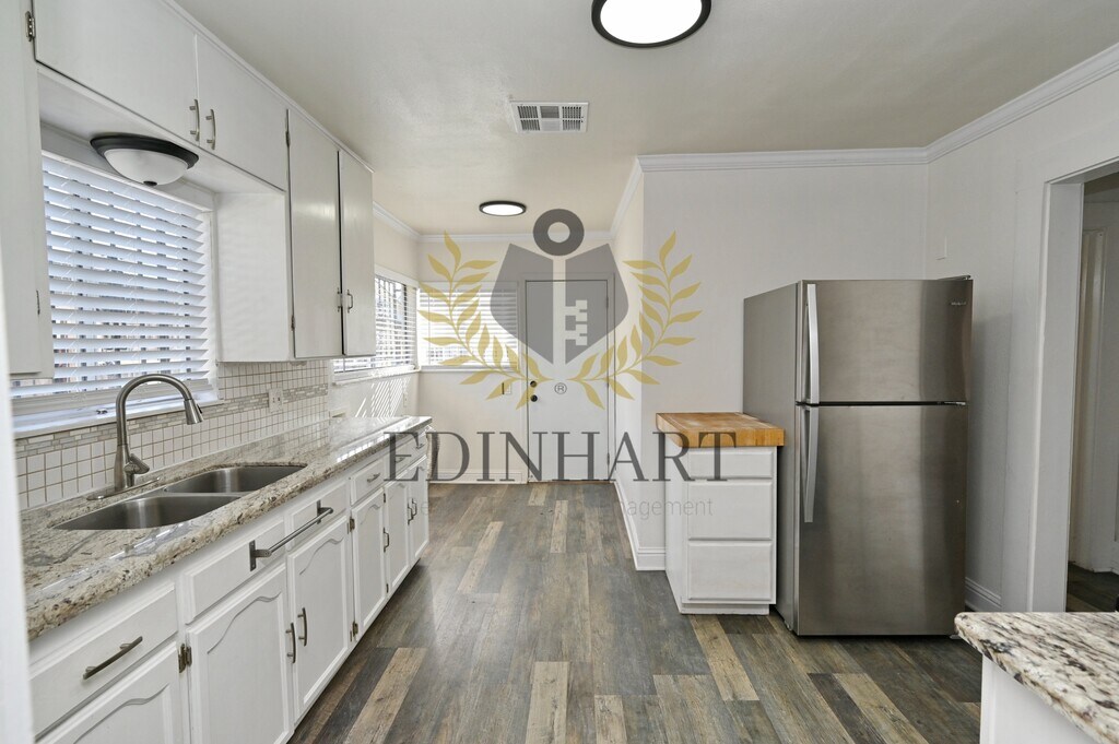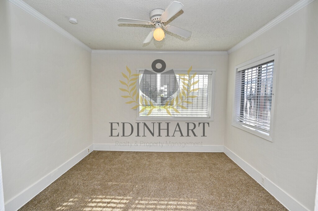 This three-bedroom, one-bath home offers a comfortable and well-maintained living space with a nice balance of charm and everyday functionality. Updated flooring runs through the main living areas, while the bedrooms feature carpet, creating a cozy and practical layout that feels easy to settle into. The kitchen is simple and refreshed, featuring white cabinetry, granite countertops, and a stainless-steel gas range that works well for daily use. Natural light fills the home, and subtle updates like crown molding and modern fixtures add to the overall feel without overpowering the space. Each bedroom includes a closet, ceiling fan, and window coverings, and the bathroom has been updated with a tiled shower and a granite-topped vanity. The neutral color palette throughout makes the home easy to personalize. The backyard provides usable outdoor space, with landscaping included for convenience. A refrigerator is included. Tenants are responsible for all utilities. No pets are allowed. A security deposit and renters insurance are required.
