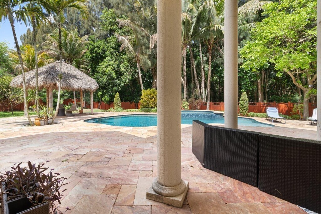 Indulge in unrivaled luxury within the largest home in this prestigious community. This grand 4/4 single-family estate rests on a quiet cul-de-sac,backing to a protected forest preserve for ultimate privacy. Three-quarters of the yard is surrounded by nature,creating a serene sanctuary.Exquisite interiors feature high-end finishes and a massive chef's kitchen designed for entertainment,plus a versatile split floor plan with two bedrooms downstairs and two upstairs. The resort-style backyard features a sparkling pool and relaxing Jacuzzi,perfect for private gatherings. Enjoy a maintenance-free lifestyle as the landlord includes landscaping and pool maintenance in the rent.Ideally located close to Nova Southeastern University and just minutes from Hard Rock entertainment. MLS ID B26008476