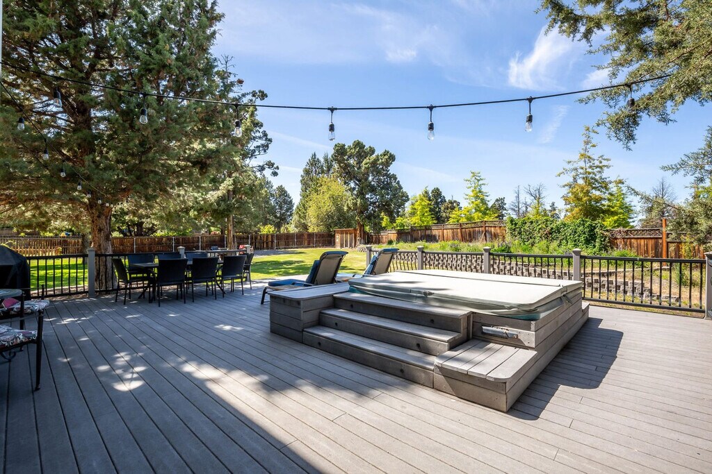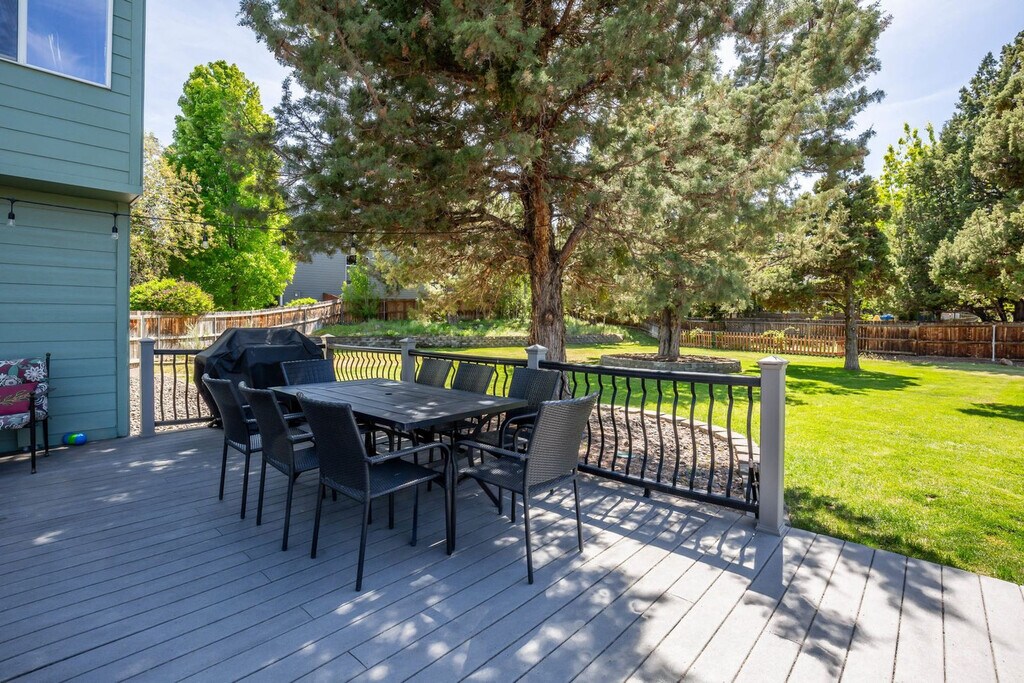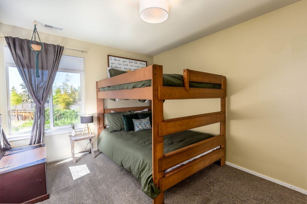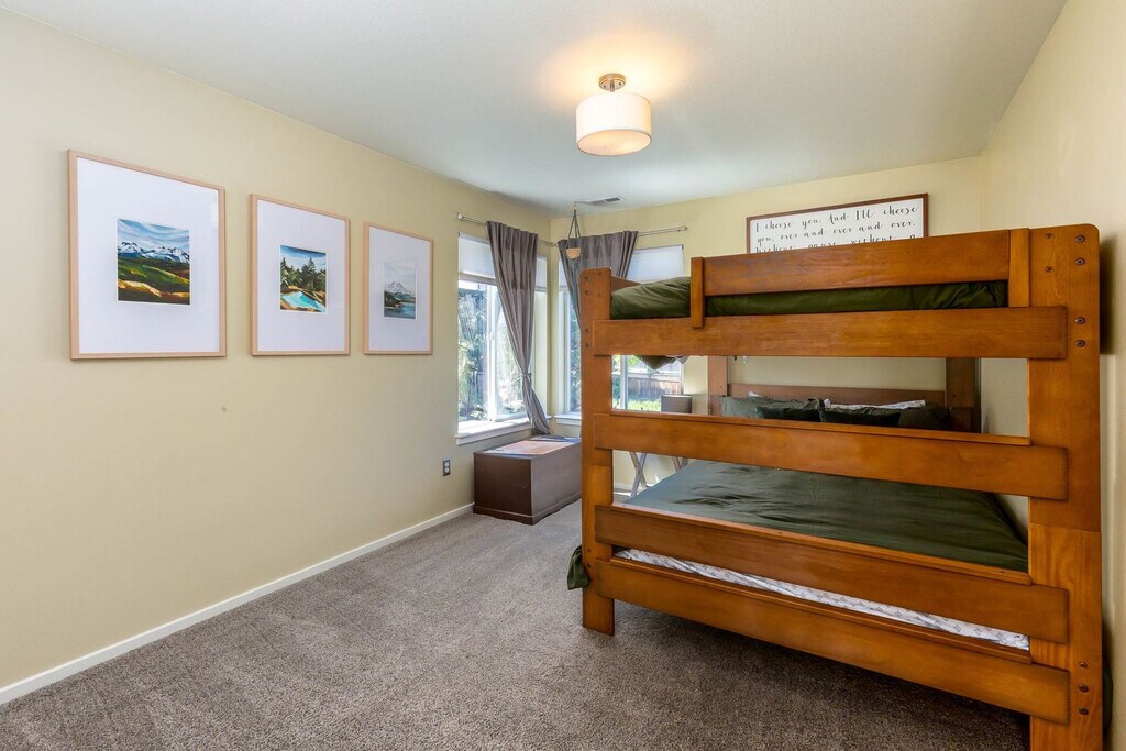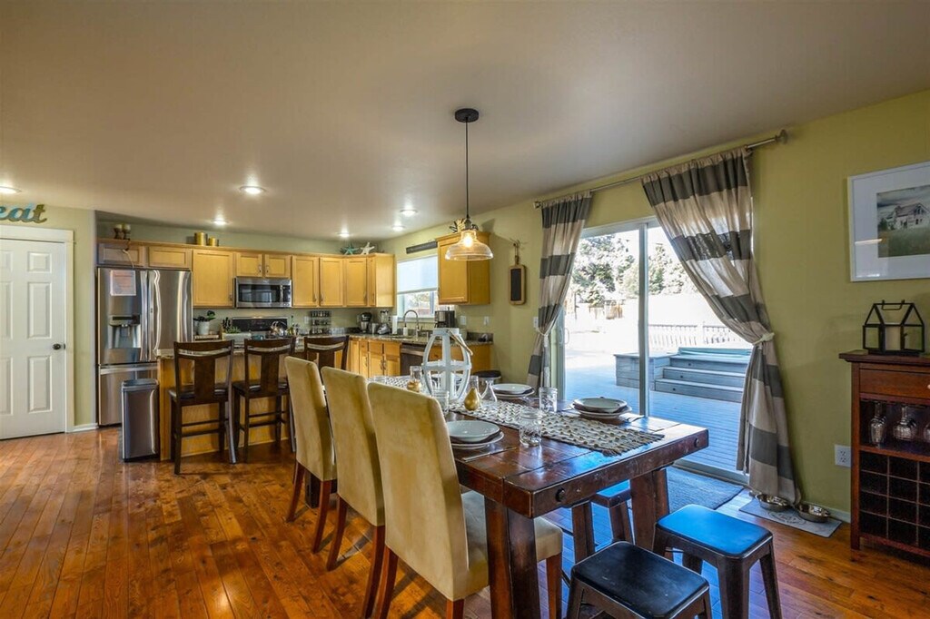 Feel at home in this stunning 4-bedroom, 2.5-bath home in Bend, Oregon, thoughtfully designed for relaxation and fun. This home is perfect for families, friends, and outdoor adventurers alike. The welcoming living room features cozy furniture, large windows, a gas fireplace, and smart TVs, plus a sleeper sofa. The master bedroom offers a king-size bed, a walk-in closet, a small desk, a smart TV, and an en suite bathroom with his-and-hers sinks and a double shower. The second bedroom boasts a queen-over-queen bunk bed and a walk-in closet. The third and fourth bedrooms feature a king-size and a queen-size bed, along with closets stocked with board games. The spacious kitchen has granite countertops, a double-door refrigerator, and all the essentials, including a crockpot and an Instapot. The dining table seats 12 and overlooks the stunning backyard through sliding glass doors. The fully fenced backyard spans half an acre and includes a firepit area, a gas barbecue grill, and a hot tub. Two adult bikes are available. Pets are welcome with a fee of $40 per dog for the entire stay. Located in a cute, family-friendly neighborhood in East Bend, this home is close to Tumalo State Park, Sisters, and the Crooked River out towards Prineville. Pine Nursery Park is across the street. Nearby attractions include Lava Butte (18 miles away), Tumalo State Park (5 miles away), Benham Falls (18 miles away), High Desert Museum (10 miles away), LaPine State Park (30 miles away), Old Mill District (4.5 miles away), Downtown Bend (3.5 miles away), Mt. Bachelor (26 miles away), Riley Ranch Preserve (4 miles away), Paulina Lake (42 miles away), Sparks Lake (31 miles away), Davis Lake (57 miles away), Sisters (21 miles away), Smith Rock (24 miles away), Crater Lake National Park (94 miles away), and Painted Hills and John Day Fossil Beds (82 miles away). Nearby restaurants include Hola East (2.8 miles away), Worthy Brewing (3 miles away), Bridge 99 Brewing (1 mile away), On Tap Food Carts (2.5 miles away), 10 Barrel East (0.8 miles away), and Ponch's Place (1.0 mile away). Outside activities need to wind down by 10 pm in accordance with neighborhood guidelines and the Bend Noise Ordinance. If a noise complaint is called in by a neighbor after 10 pm, the Deschutes County Sheriff will be notified. No smoking is allowed on the property. Guests are responsible for any injuries or damages caused by pets. All cars are to be parked in the driveway, with a maximum of one car per bedroom unless otherwise approved. Guests must be 23 years or older to book a reservation. [SI]
