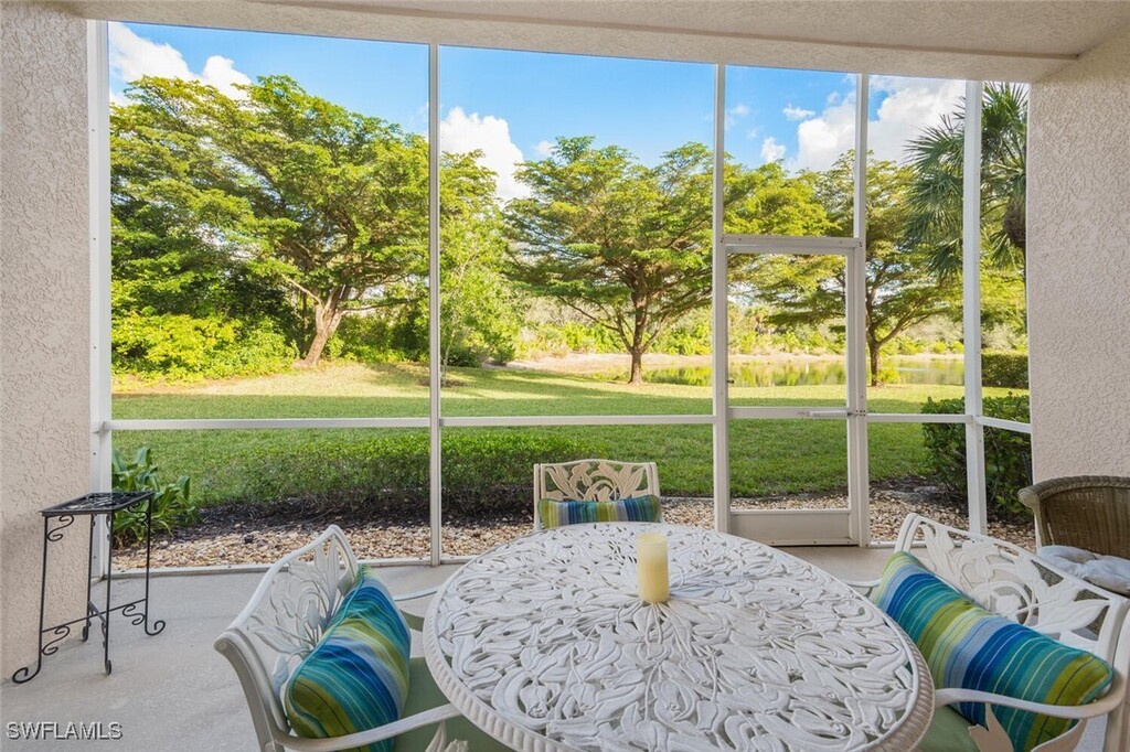 JUST LISTED QUIET & IMMACULATE. Gated First floor end unit with WATER VIEW,ALL light tile flooring throughout & READY FOR OCCUPANCY NOW until January 31,2026. Leased Feb,March & April 2026.. ONCE WEEKLY GROUP GOLF IS AVAILABLE WITH THIS RENTAL NOVEMBER THROUGH APRIL. Group rate is $129 in season & $59 Nov,Dec & April. Non-group is $159. Stainless appliances,open & fully stocked kitchen,TWO screened & hurricane shuttered patios plus volume ceilings and an attached garage with guest parking. Double door entry to both the master suite and to the giant den with it's own screened patio. Furniture in master bedroom is all NEW light wood & looks fabulous. Den furniture now has light cream sofa & loveseat,blue chair with ottoman,bright beach pictures on the walls & looks great also!! NEW photos coming soon!! Large laundry room with a sink,lots of cabinets & window. Enjoy a peaceful large lawn & water view & the Lexington community pool is just steps away with the larger Carlton Lakes lap pool,spa,fitness,library,tennis courts & Clubhouse just 3 streets away.. AVAILABLE NOW with Flexible leasing dates.. Lease just for summer,4 months or more in season or annually. Walk to the fabulous Seed to Table grocery store & Dunkin donuts. Close proximity to Wal-Mart super center,restaurants,interstate & more..