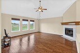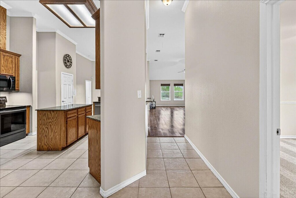 Beautiful Kings Crossing subdivision, features a spacious modern open floor plan with abundant natural light and high ceilings. The main living space offers laminate flooring, while the kitchen features a center prep island, breakfast bar, stainless steel appliances, granite countertops and tile floors, plus lots of custom cabinets. The large primary bedroom includes an ensuite bathroom, a sizable walk-in closet and a private patio entrance; the primary bath has a separate walk-in shower and soaking tub. Four bedrooms and 2.5 bathrooms provide roomy secondary rooms and carpet in the bedrooms; an office or fifth bedroom adds flexibility. Additional highlights include ceiling fans, central heat/air conditioning, a covered patio overlooking a walk path, and washer and dryer included. Call today to schedule your viewing!