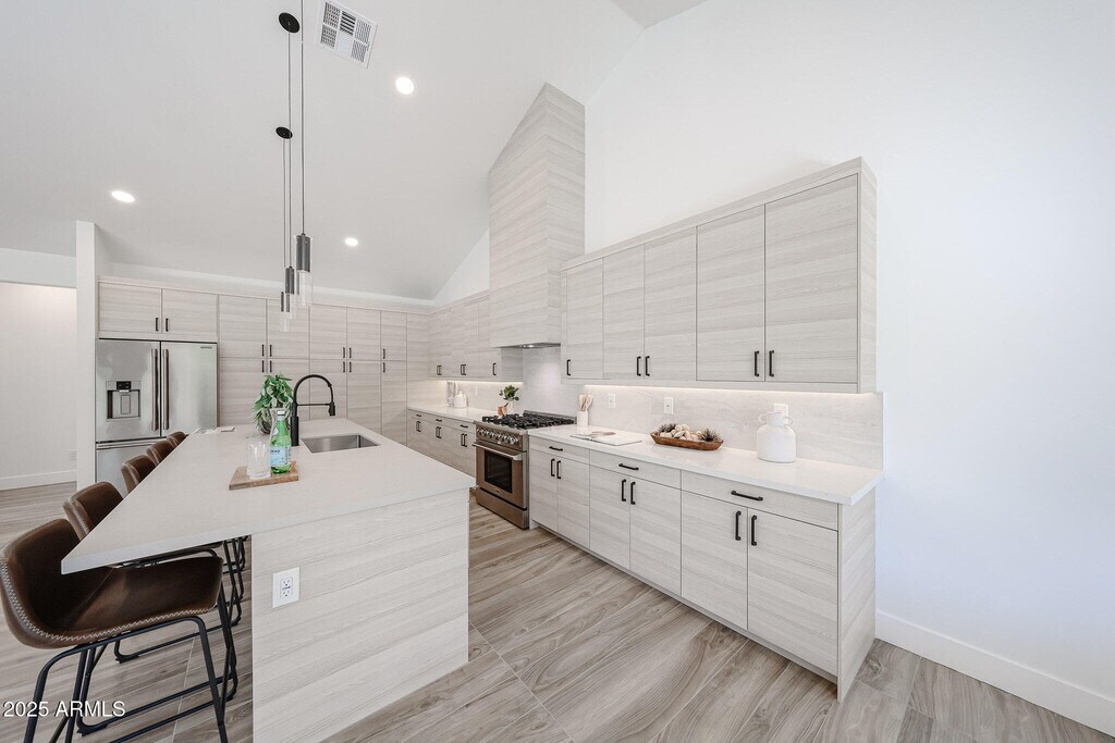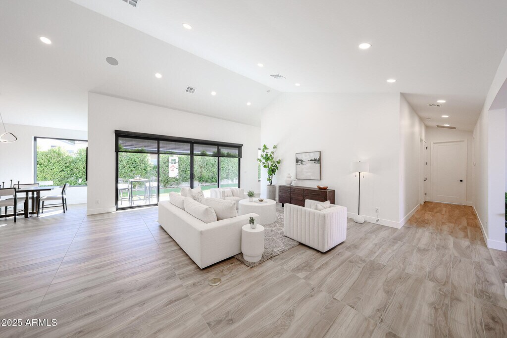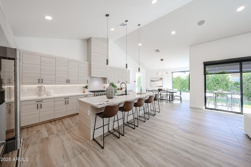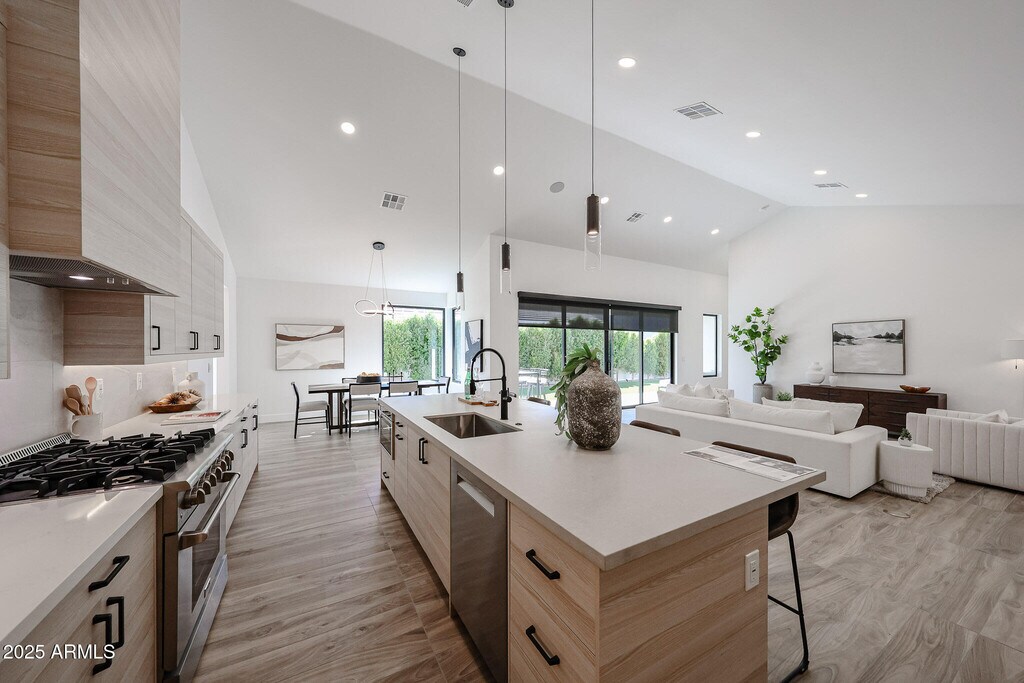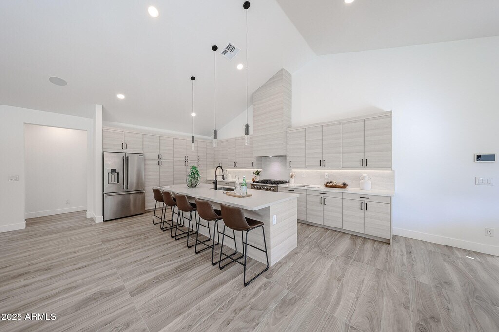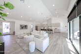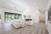 This single-level 4-bedroom,3.5-bath residence offers 2,680 square feet of beautifully designed space,combining sustainability,technology,and comfort. Inside,the floor plan is open yet functional,with vaulted ceilings,16' sliding glass doors,and oversized bedrooms and bathrooms. The chef's kitchen features quartz countertops,Energy Star appliances,and custom cabinetry,all designed to complement the home's sleek,modern aesthetic. Step outside to the covered back patio and landscaped backyard,perfect for relaxing or entertaining.