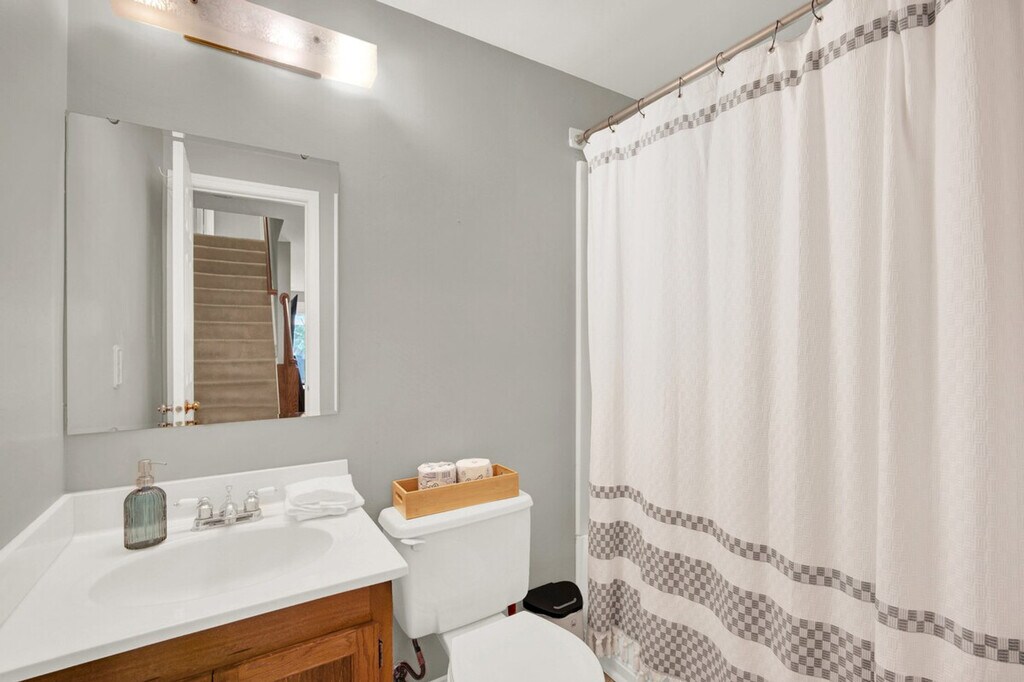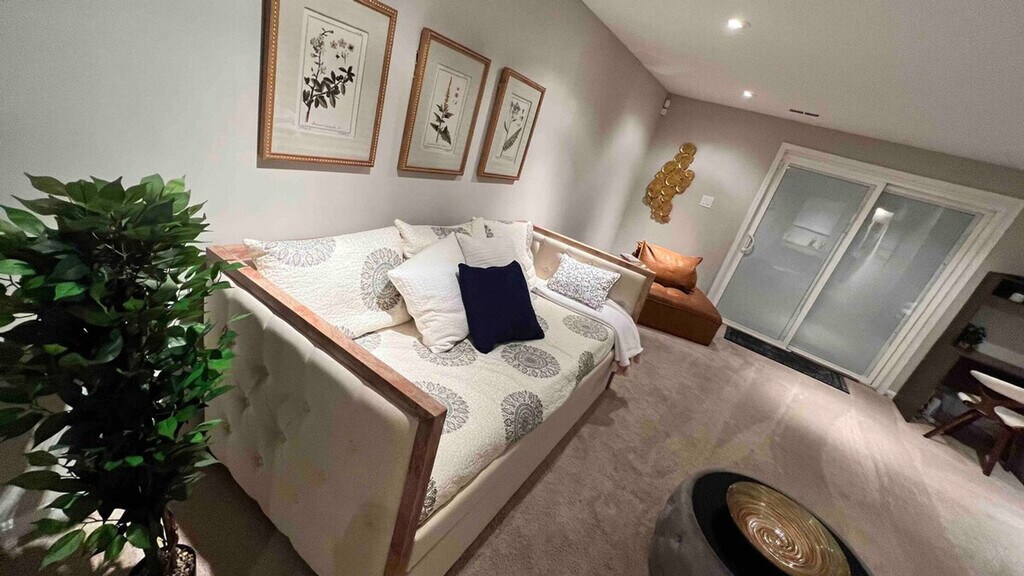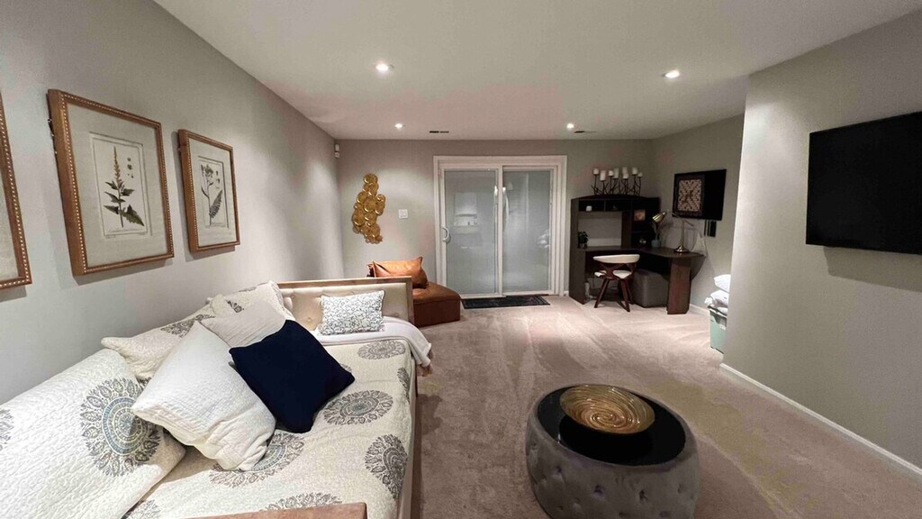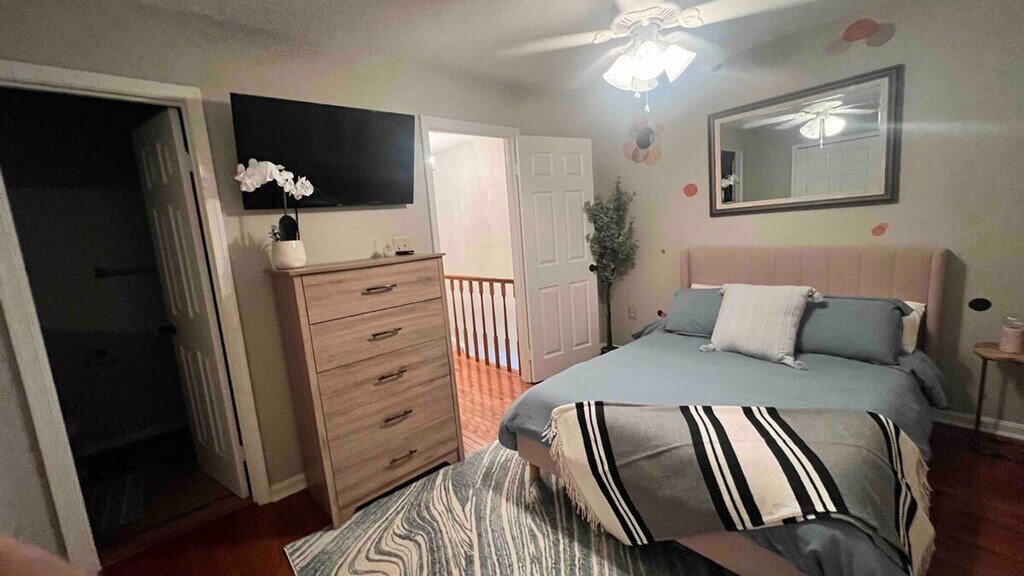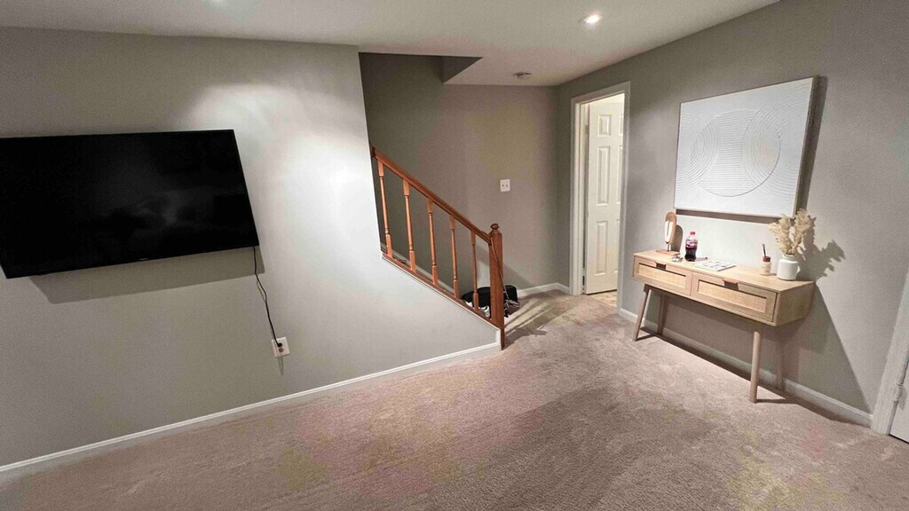Feel at home in this stunning, recently renovated 3-story home. This elegant gem offers a modern yet warm living experience. The kitchen is equipped with new stainless steel appliances and a Wi-Fi enabled LG washer/dryer. The second floor opens up to an expansive living room with an open concept kitchen, complete with brand new appliances. A well-defined dining area is ideal for hosting gatherings, while a convenient guest bathroom ensures comfort for your visitors. The finished basement is a versatile haven that leads directly to the backyard and features an attached bathroom with a relaxing bathtub. There are two assigned parking spots directly in front of the home and plenty of guest parking in the neighborhood and along the street. Conveniently located close to Kingstown Shopping Center and Ft. Belvoir, this home offers easy commuting to Interstate 495 and Van Dorn/Huntington Metro. Step outside to your backyard oasis, where you'll find peach trees bearing fresh fruit and a serene forest located right behind the home, where miles of private trails await. There are 3 smart TVs available for use and the home is equipped with Wi-Fi enabled security doorbells, entry systems, and thermostat monitoring. Includes a thoughtfully furnished workspace in the basement. Top Floor Tranquility (Top Floor): Ascend to the top floor where serenity awaits. Two spacious bedrooms, each boasting its own private attached bathroom, offer you the ultimate in privacy and convenience. Open Concept Living (Main/First Floor): Need extra space for guests? Unfold the sleek sofa with a pull-out bed for a restful night's sleep. Versatile Basement Retreat(Downstairs Basement): A daybed with a pullout trundle provides a playful sleeping area for kids and young adults, making sleepovers a breeze. Outdoor Delights: Step outside into the enchanting backyard, perfect for soaking up the sun or hosting outdoor gatherings. Embrace the joys of nature right at your doorstep. A large fruit bearing tree covers your outdoor grill in shade, making this the perfect spot to have a family BBQ. Guests have complete and private access to the entire home, backyard and neighborhood forest. [SI]