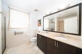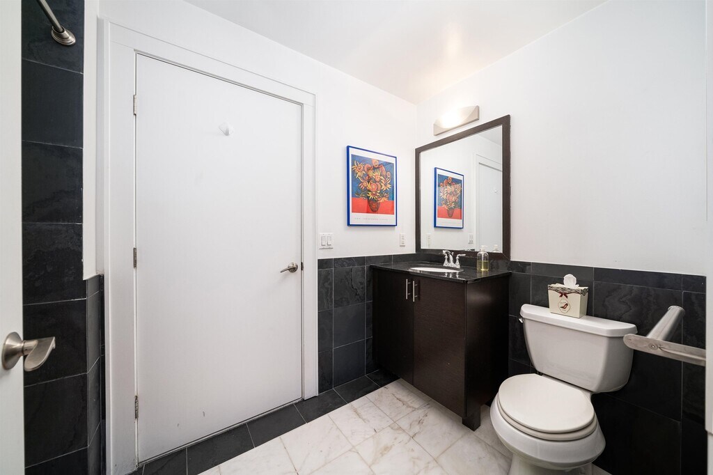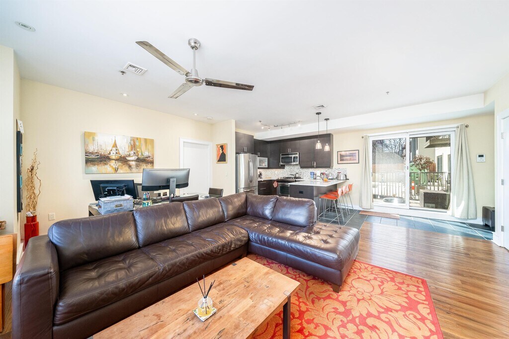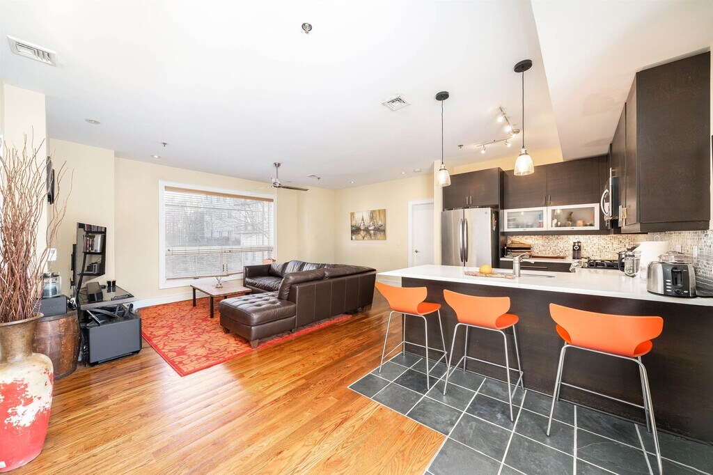 Residence 2A at 635 6th is a bright, well maintained, 2 bed/2 bath in a modern steel and concrete elevator building. As you walk through your proper entryway into the unit you'll be welcomed into a large open concept living and dining area boasting large windows and expansive terrace. The well-appointed chef's kitchen showcases elegant espresso cabinets, quartz countertops, under-cabinet lighting, a full suite of stainless steel appliances, and a breakfast bar with seating for 3-4 people. The generous primary bedroom features a sizable walk-in closet and an en-suite bathroom with a separate shower and jacuzzi tub, a double vanity, and natural stone tile. The second bedroom has its own access to the bathroom, adorned with chic black and white marble and slate-style tiles. This exceptional offering comes complete with video front door system, a large garage parking spot, a terrace overlooking your shared backyard with furniture + grill for summer BBQs, in unit washer/dryer, central AC/heat, bicycle storage, gleaming hardwood floors. Conveniently located in midtown, this residence provides easy access to various commuting options such as NJ Transit bus routes to Port Authority, LightRail, PATH, and the Hoboken Hop. Discover and relish in the vibrant artistic community, entertainment venues, shopping destinations, and dining experiences situated at the nearby Monroe Center. Additionally, enjoy leisurely strolls to the 2-acre 7th & Jackson Park, which features a community gymnasium and a children's playground, adding to the charm and allure of this desirable location.