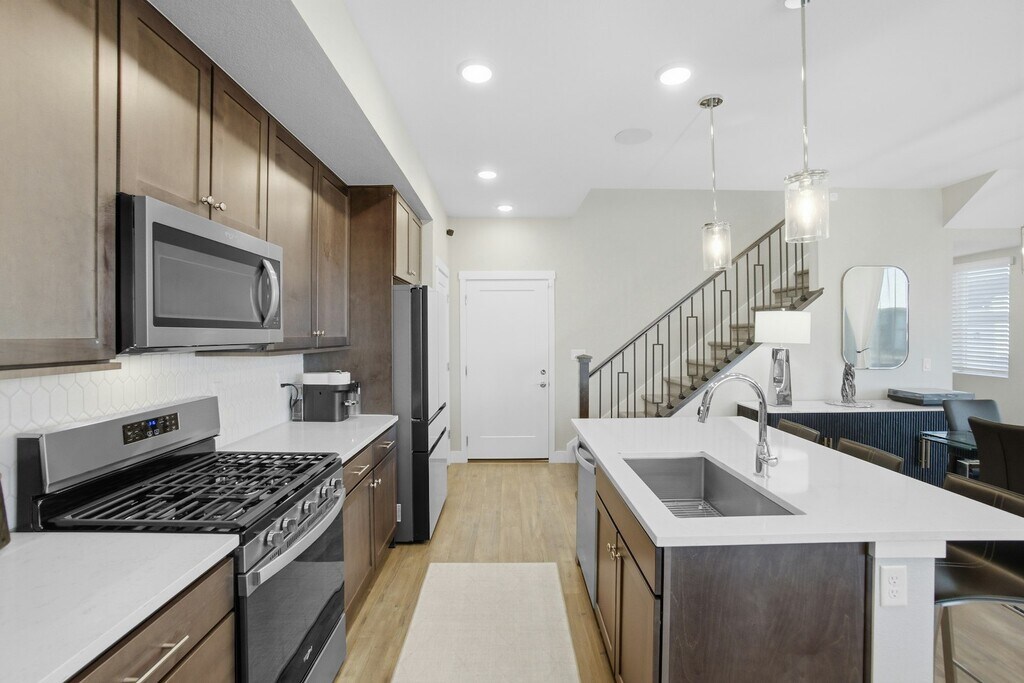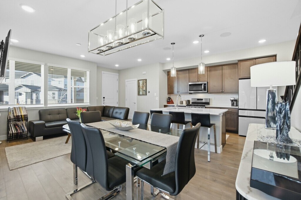 Experience refined living in this beautifully appointed two-story home with a fully finished basement, ideally located in Denver’s highly sought-after Central Park neighborhood. Offering three spacious bedrooms and four bathrooms, this home blends everyday comfort with upscale finishes in a thoughtfully designed layout perfect for both relaxing and entertaining. From the moment you enter, you’re greeted by a bright, open-concept main level where modern style meets functional living. The kitchen features upgraded cabinetry, gleaming quartz countertops, a center island, and premium stainless-steel appliances, making it ideal for hosting or casual meals. The adjacent dining area is highlighted by a an amazing deck and side yard, creating an easy indoor-outdoor connection (great for entertaining). The living room provides a warm and inviting retreat with abundant natural light and a custom wood-accented fireplace, perfect for cozy evenings or laid-back weekends. Upstairs, you’ll find three well-appointed bedrooms, including a primary suite with a spa-inspired en-suite bath offering a double vanity, walk-in glass shower, and generous walk-in closet. One bedroom includes direct access to a private balcony, an ideal spot for morning coffee or enjoying sunset mountain views. Residents enjoy all that Central Park has to offer, including excellent schools, access to eight pools, pickleball courts, nearby dining and shopping, entertainment options, and an extensive trail system. Schedule your showing today and see why this home truly stands out!