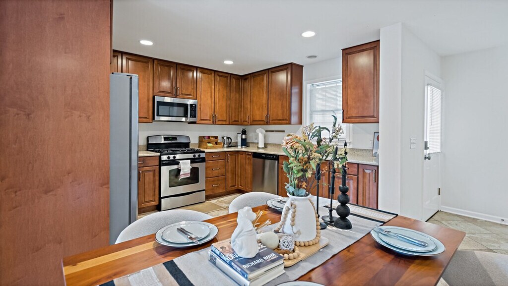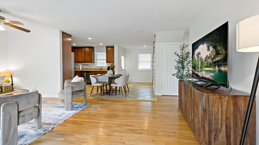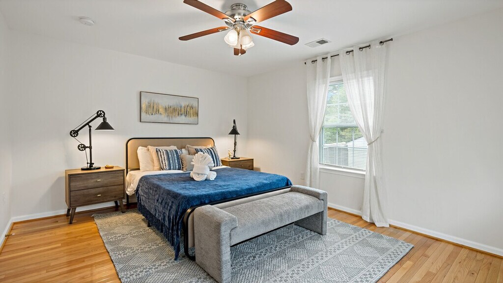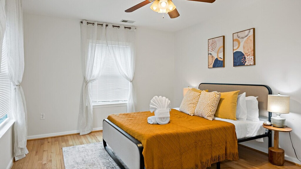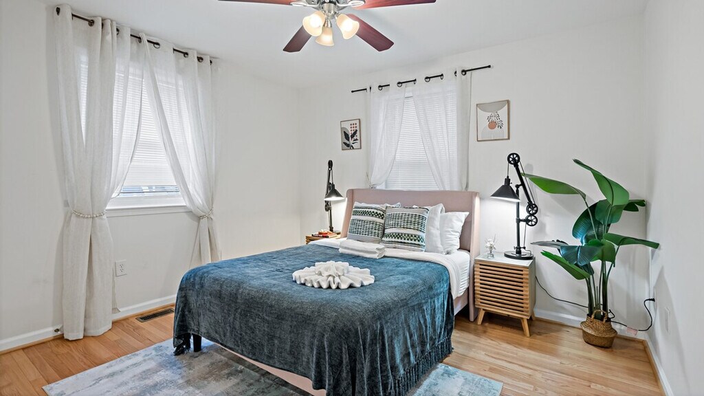 Feel at home in this spacious 4-bedroom, 3-bath home, a peaceful retreat perfect for families or groups close to DC sights. This inviting and well-appointed home offers a fully equipped kitchen with cookware, utensils, dishes, and modern appliances. The cozy living room features a comfortable sofa and a large TV, and there is a giant projector for cozy film marathons. Each of the four bedrooms is furnished with a comfortable queen-size bed, soft linens, and ample closet space. There are three full bathrooms with fresh towels and a clean, modern design. Pets are welcome for an additional fee, and free parking is available on the premises. Located in a quiet, residential neighborhood, this home offers lush gardens in the front and back. No gatherings, parties, events, or celebrations are allowed. No smoking is permitted inside the home. Only guests listed in the reservation are allowed on the property. Quiet hours are from 10 PM to 8 AM to respect the neighbors. Pets must be approved in advance and are subject to an additional fee. A valid copy of an ID or passport is required for all guests and visitors. Failure to provide a valid government-issued ID may result in cancellation. [SI]