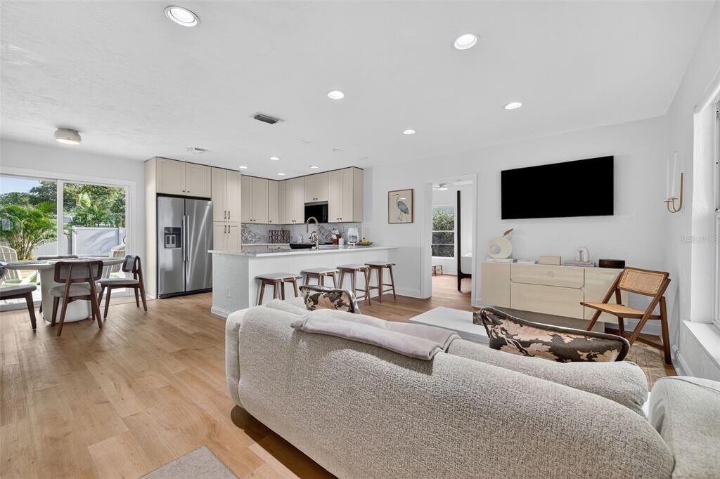 Welcome to this charming ranch-style rental home nestled in the sought after neighborhood of Snell Shores. This beauty features 3 bedrooms,2 full baths,and 1,255 square feet of comfortable living space. Thoughtfully updated throughout and partially furnished,this residence blends modern finishes with practical design,making it a perfect place to call home. Step inside to find brand-new Luxury vinyl plank flooring that flows seamlessly throughout the main living areas & bedrooms,creating a warm and inviting atmosphere. The newly renovated kitchen is sure to impress,featuring Quartz countertops,stainless steel appliances,and a convenient peninsula with seating,ideal for casual dining or entertaining. The primary bedroom offers a private ensuite bath with a double sink vanity and walk-in shower,while two additional bedrooms provide plenty of closet storage and flexibility for family,guests,or a home office. A rear storage and utility area includes a washer and dryer for added convenience,along with extra storage space to keep everything organized. Outdoor living is just as enjoyable with a private fenced backyard,complete with an open patio and cozy fire-pit—perfect for relaxing evenings or weekend gatherings. Ideally located,this home is just 10 minutes from downtown St. Petersburg,where you’ll enjoy endless options for dining,shopping,arts,and entertainment. Everyday essentials are close by with nearby grocery stores,while waterfront dining and quick access to I-275 make it easy to connect to the best of Tampa Bay. With its stylish updates,functional layout,and unbeatable location,this rental opportunity is the perfect balance of comfort,convenience,and lifestyle. Welcome home!